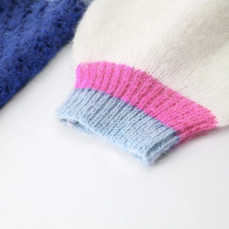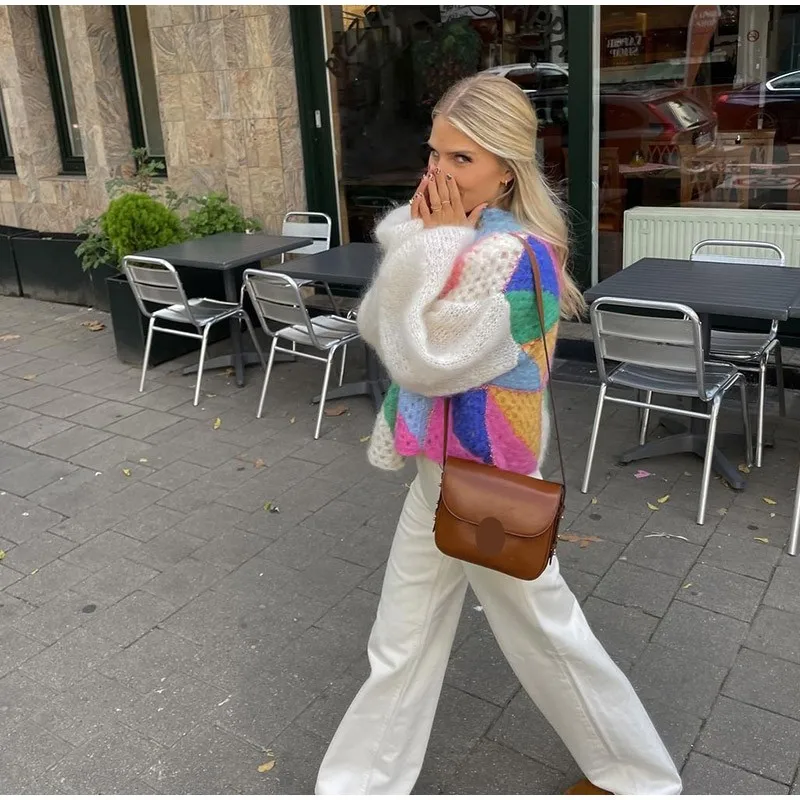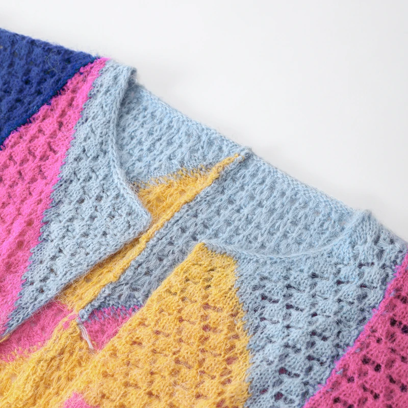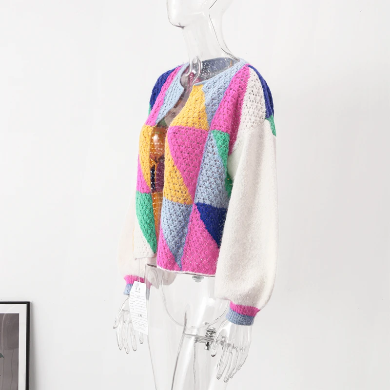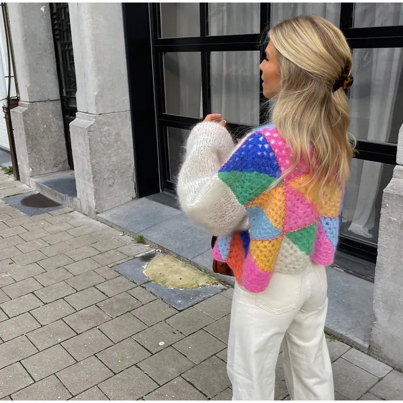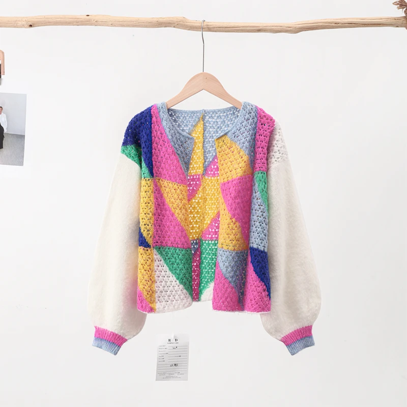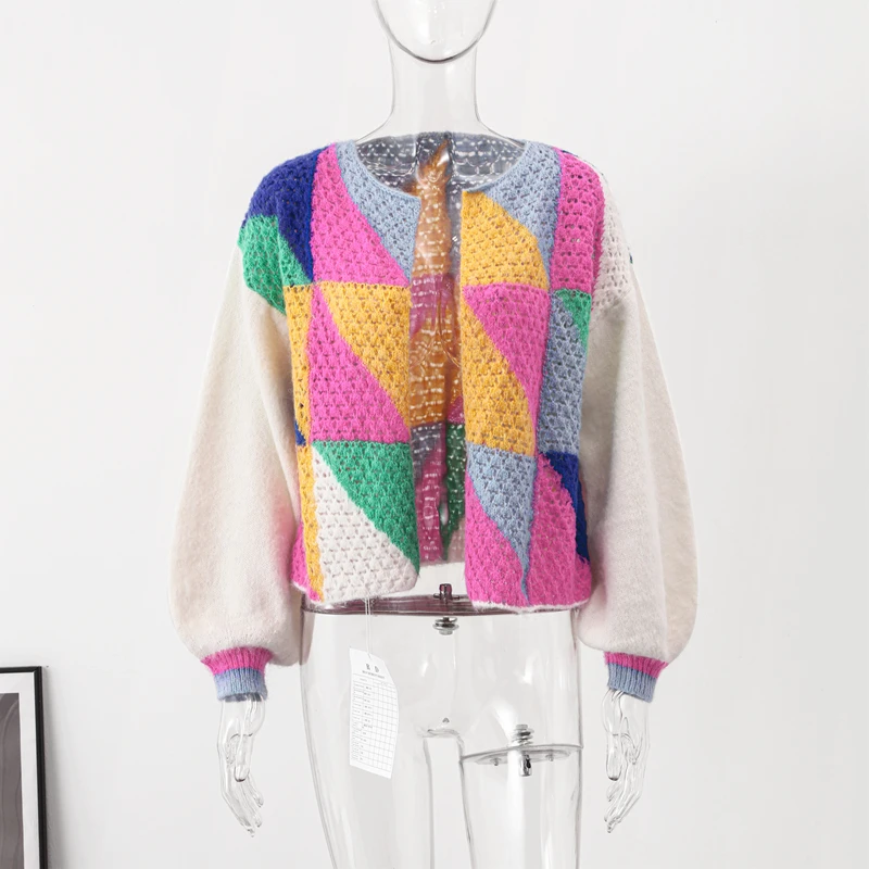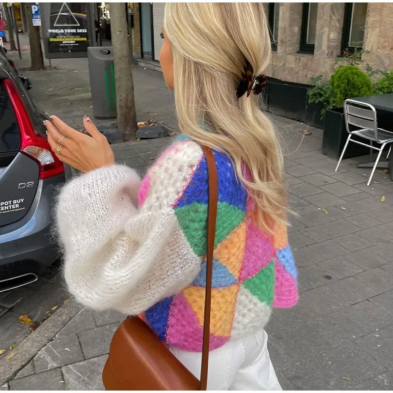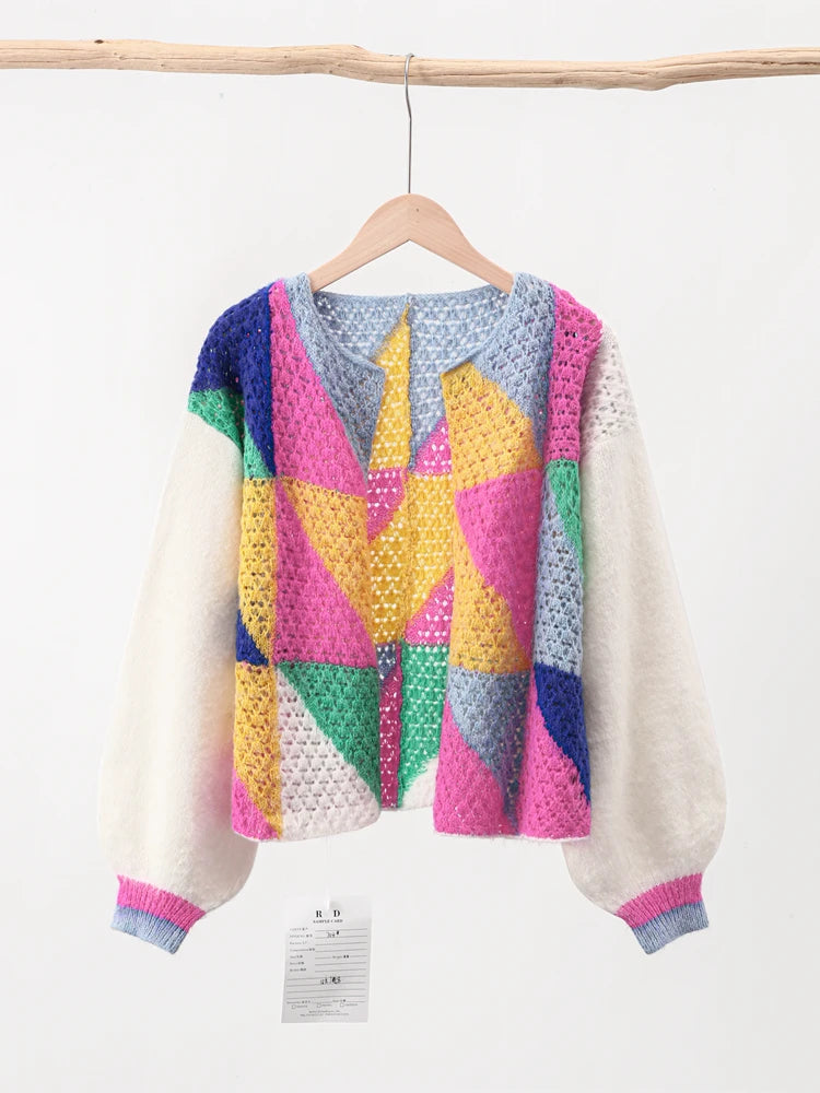 GETADME Sleeve Patchwork Female Sweaters 2025 Elegant Casual Lady Top Hollow Out Colorful Kint Cardigan Women Sweater Autumn Long Puff