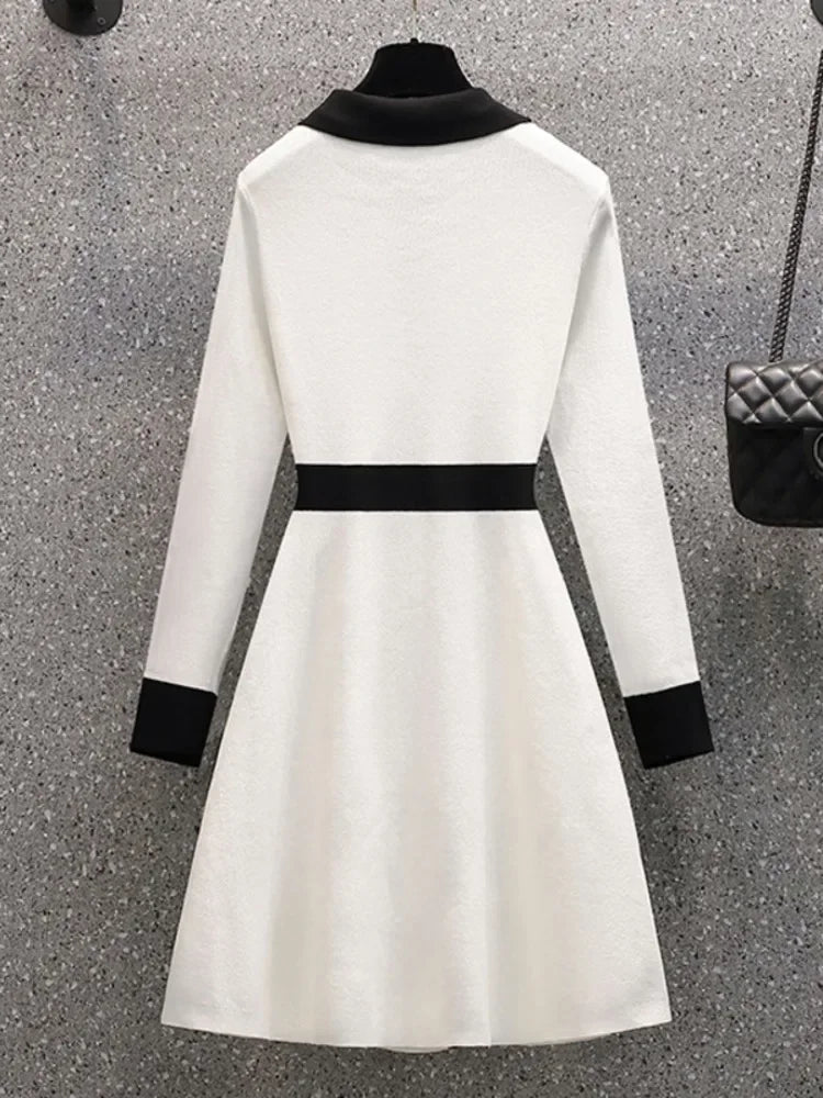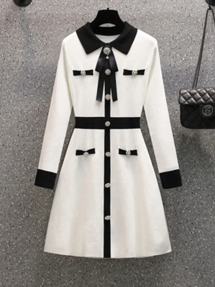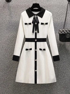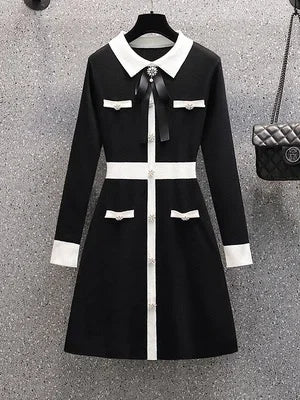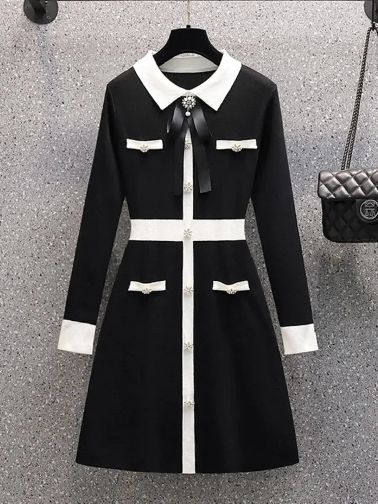 GETADME Small Fragrance Fall Winter Knitted Sweater Dress Women Bow Tie Buttons Vintage Party Mini Dress Elegant Casual Chic Robe Femme
