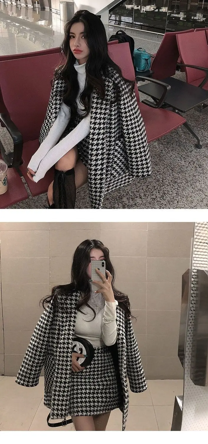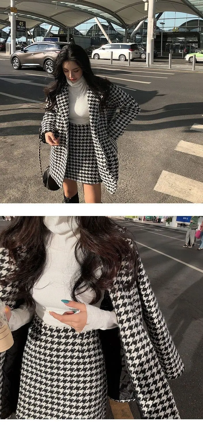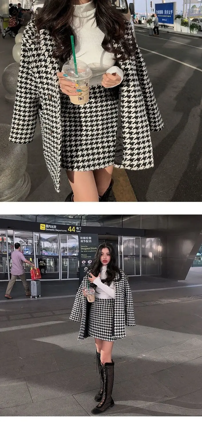 GETADME Spring Autumn 2025 New Houndstooth Suit Women's Fashion Loose Double-Breasted Cotton Woolen Coat+High Waist Skirt Two-Piece Suit