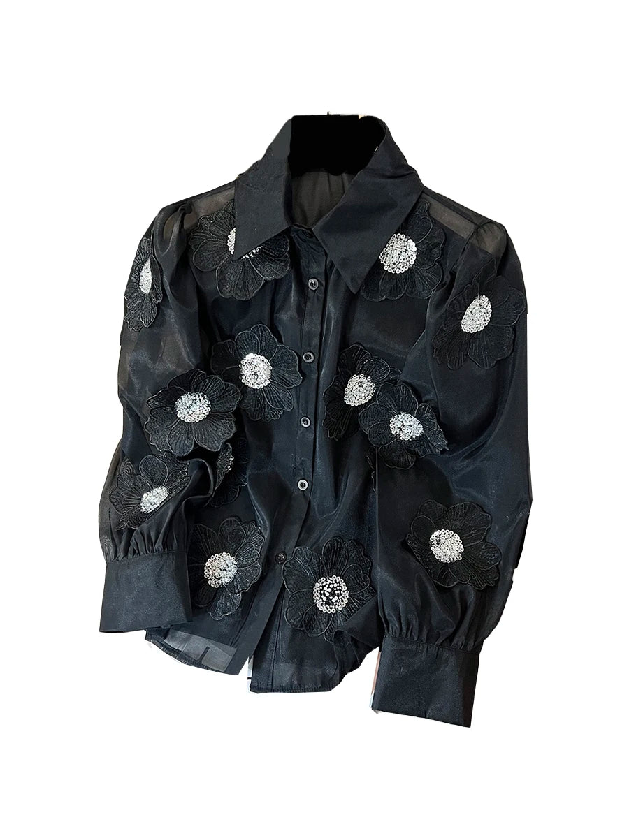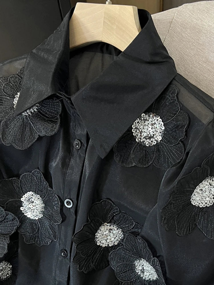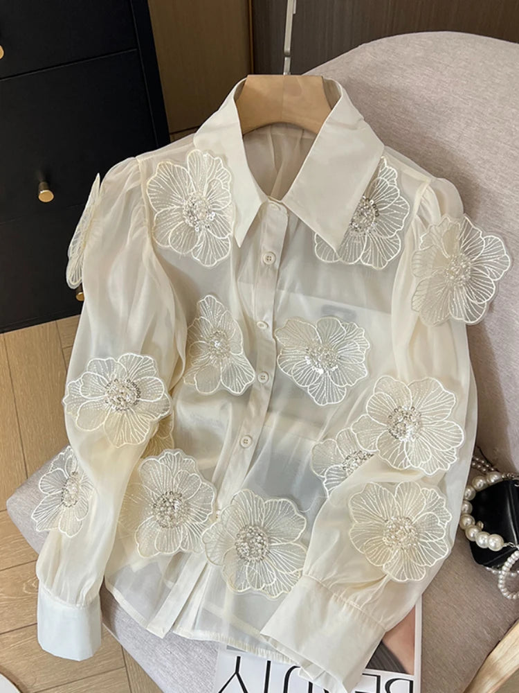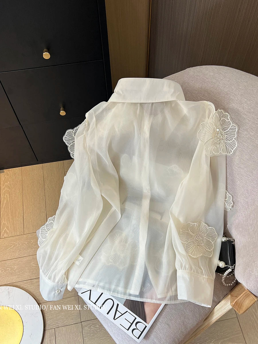 GETADME Spring Summer Long Sleeve Sequins Petals Applique White Beige Mesh Shirts and Blouses For Women Sexy See- through Tops