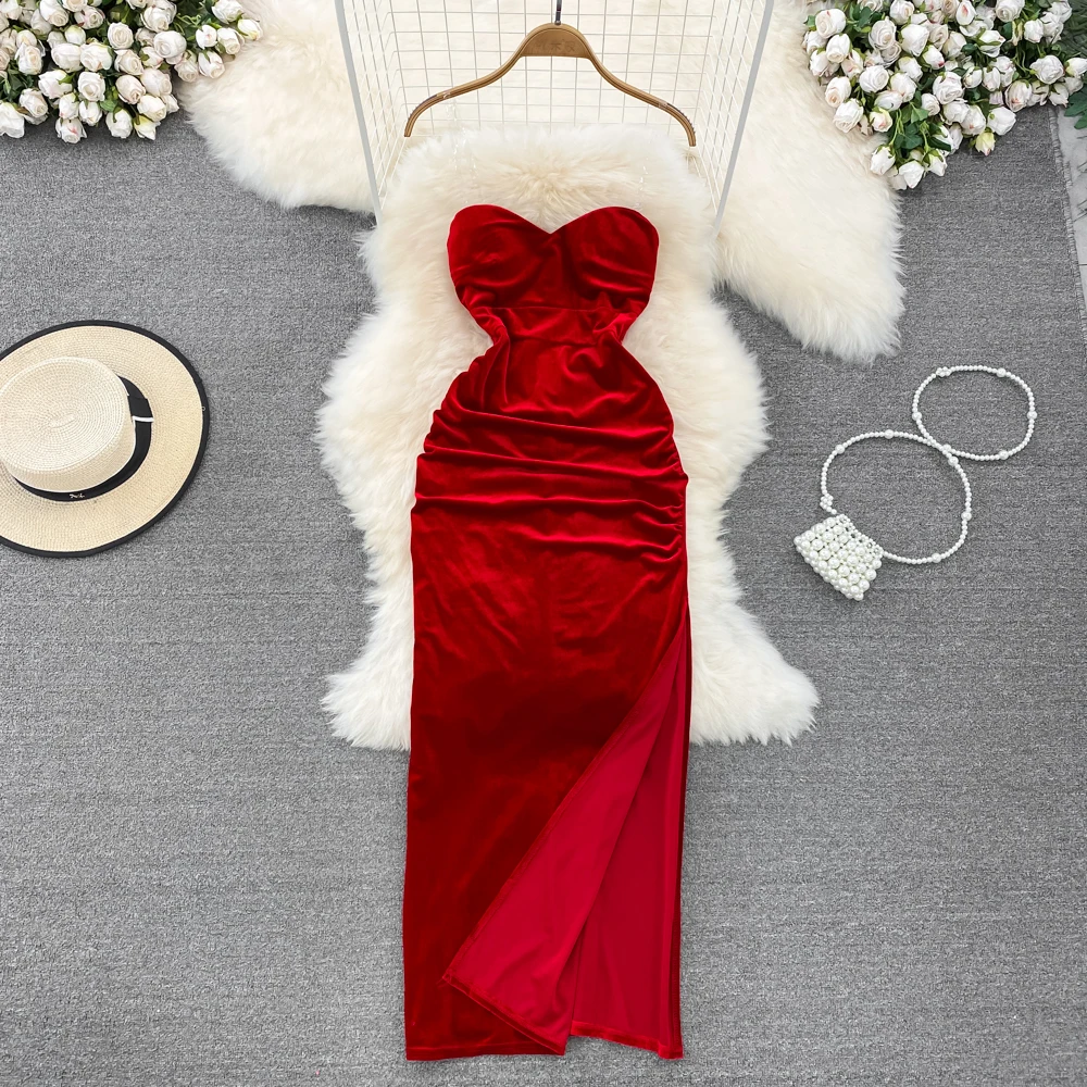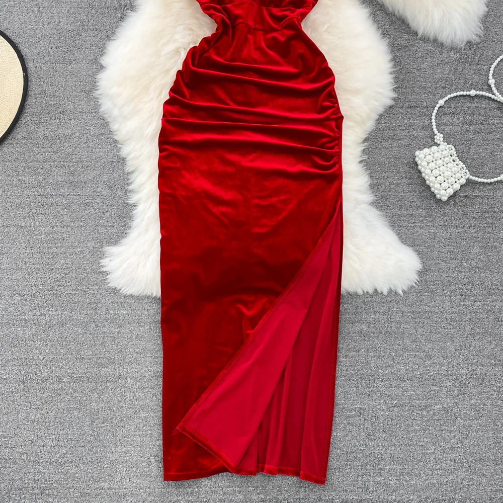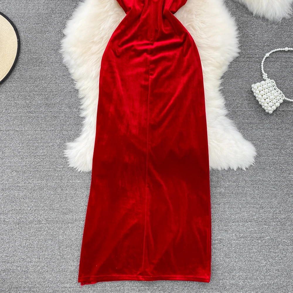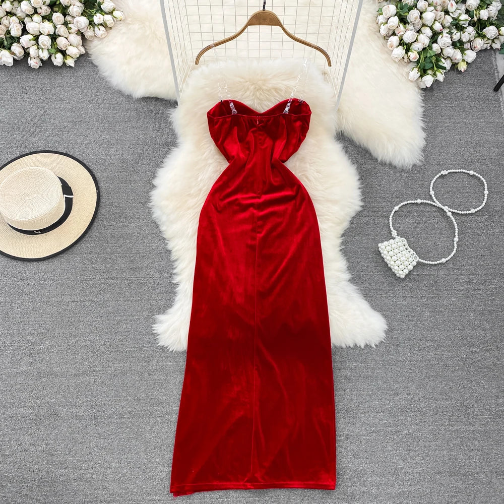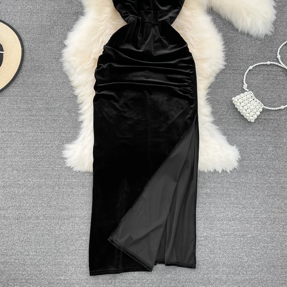 GETADME Spring Summer Sexy Maxi Dresses for Women Bodycon Velvet Strap Backless Female Robe Elegant Vintage Split Party Holiday New In