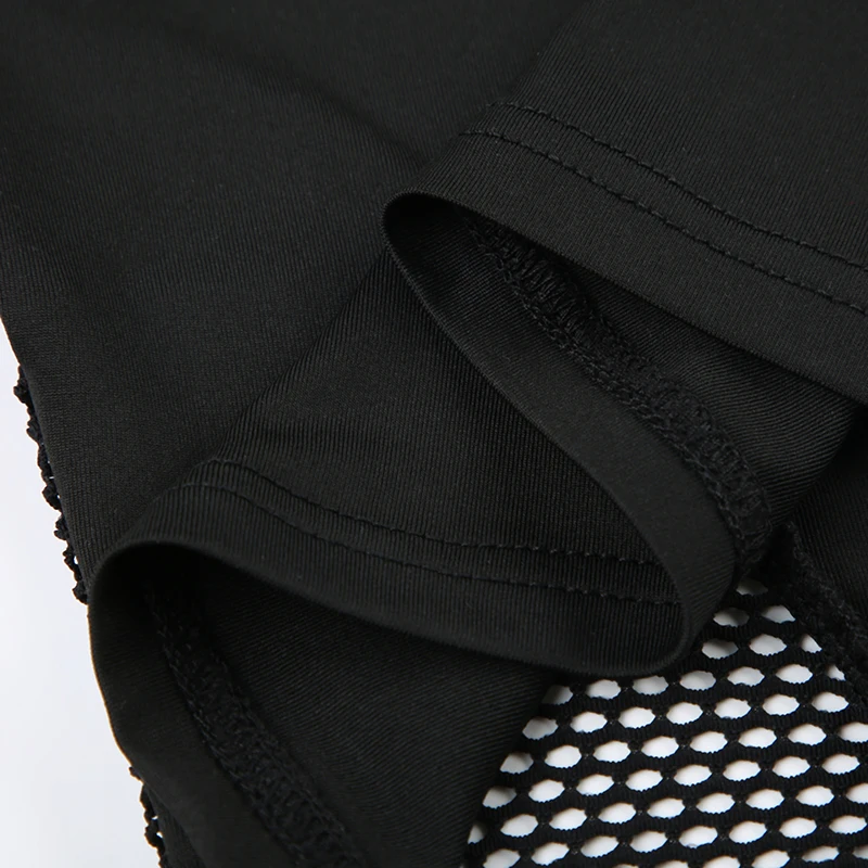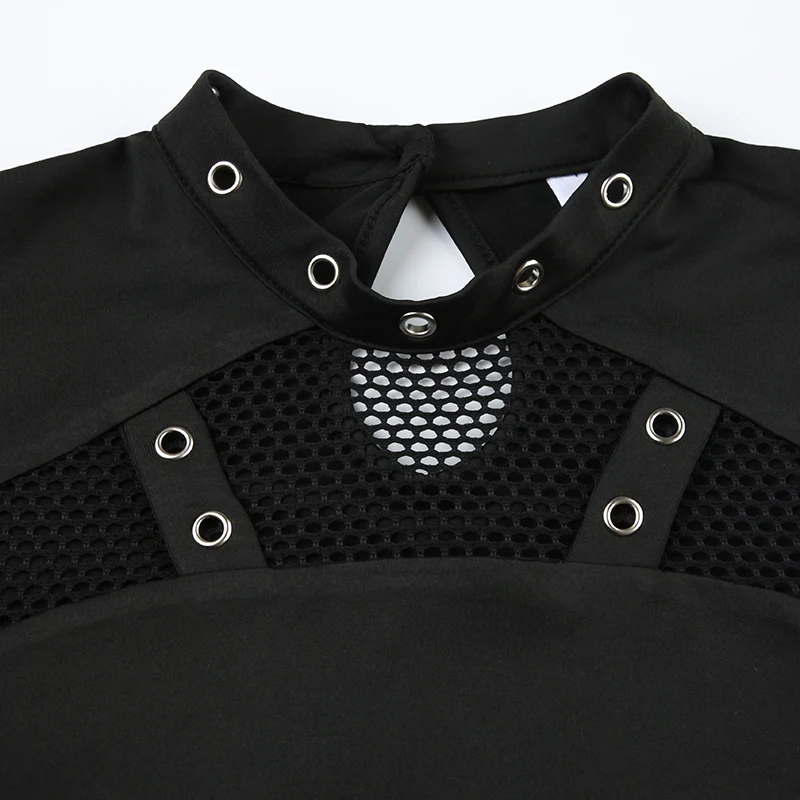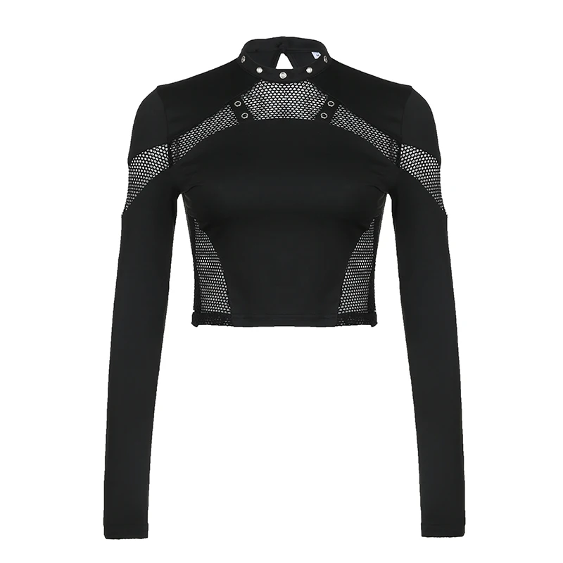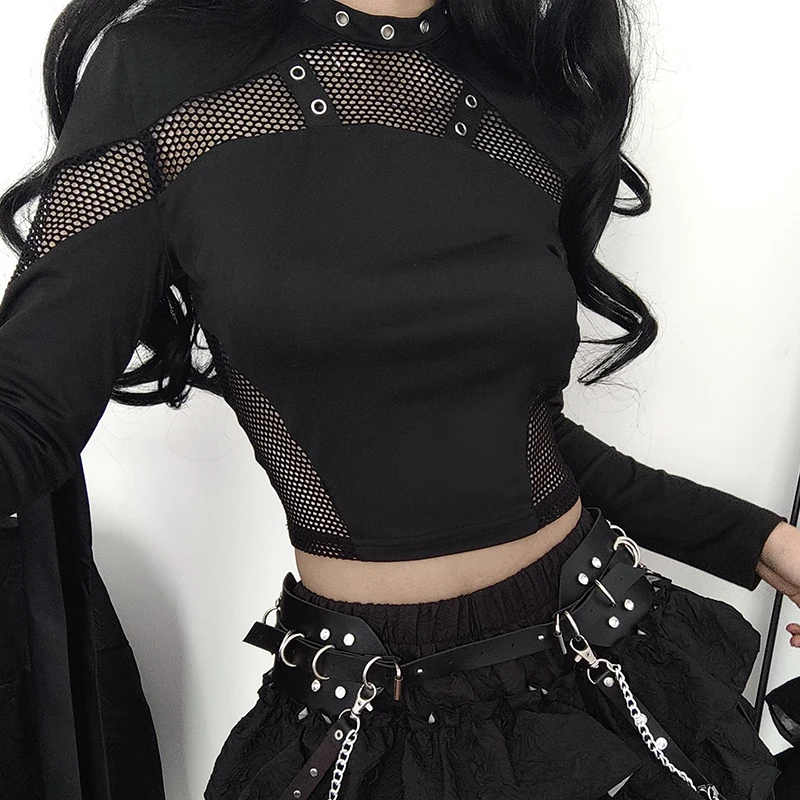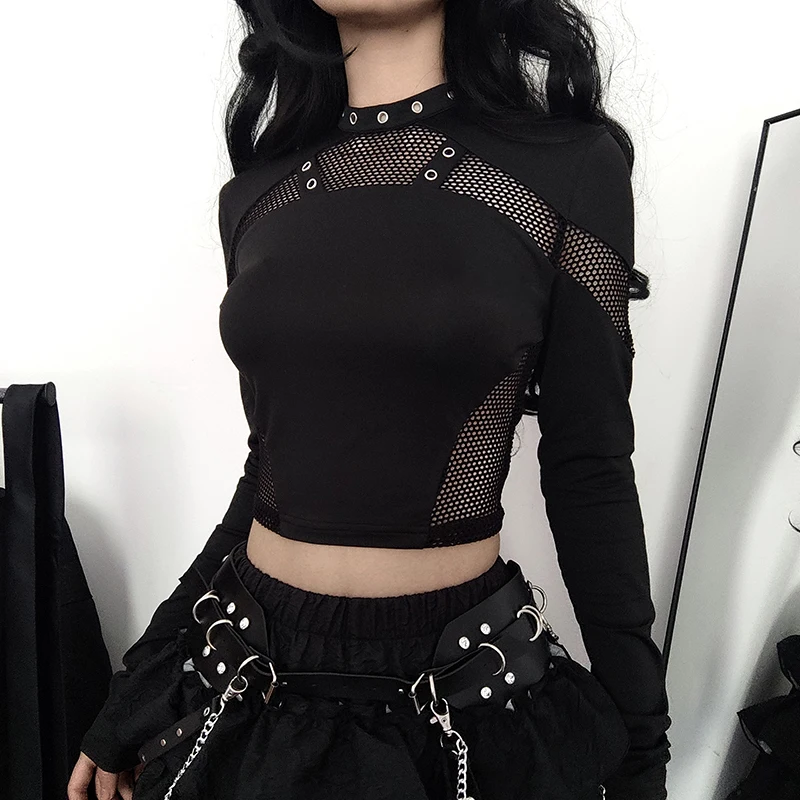 GETADME Goth Mesh Patchwork T-Shirts Sexy Hollow Out Long Sleeve Eyelet Crop Tops Fashion Women Punk Style Slim Tees Streetwear