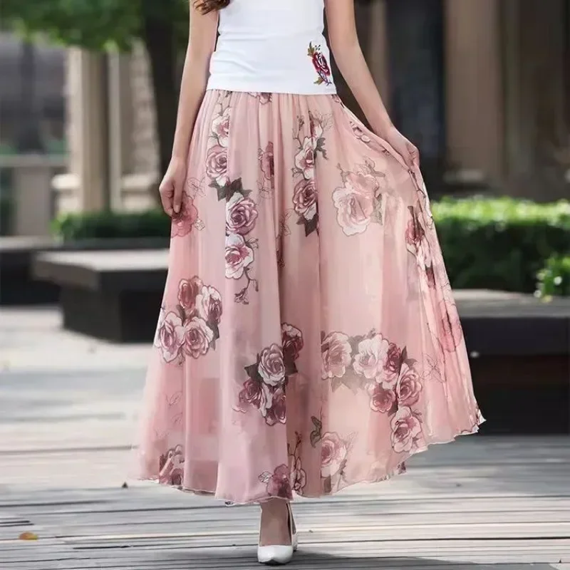 GETADME Summer Chiffon Floral Maxi Skirt Women Long High Waist Holiday Dance Skirt Elegant Beach Boho Hot Sale Lady Vintage Girl Fairy