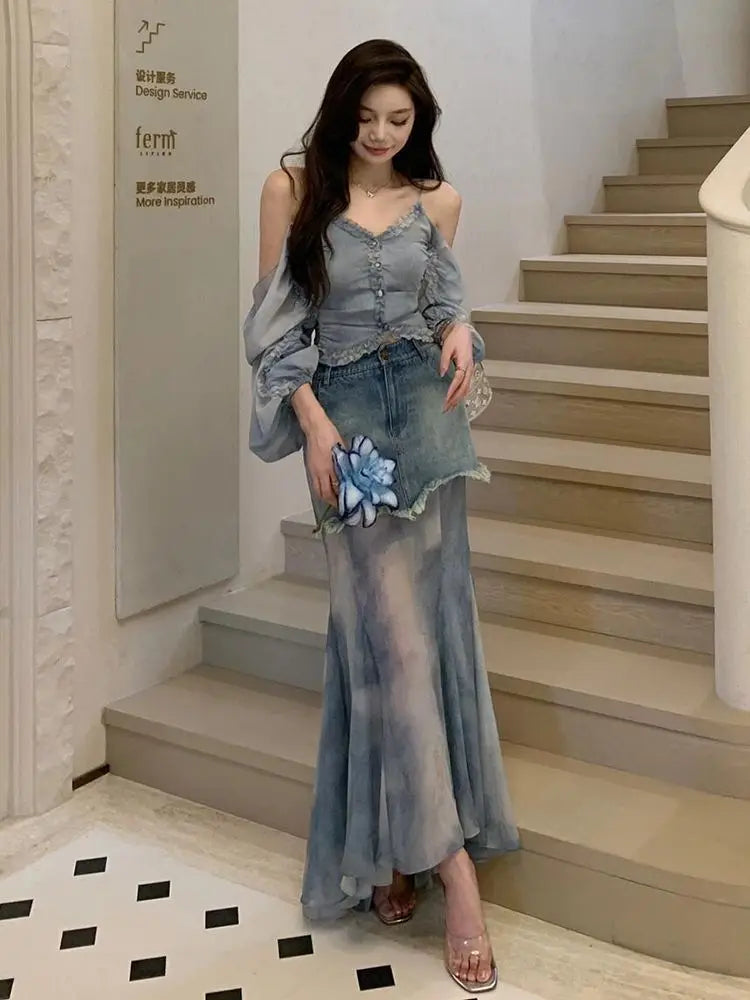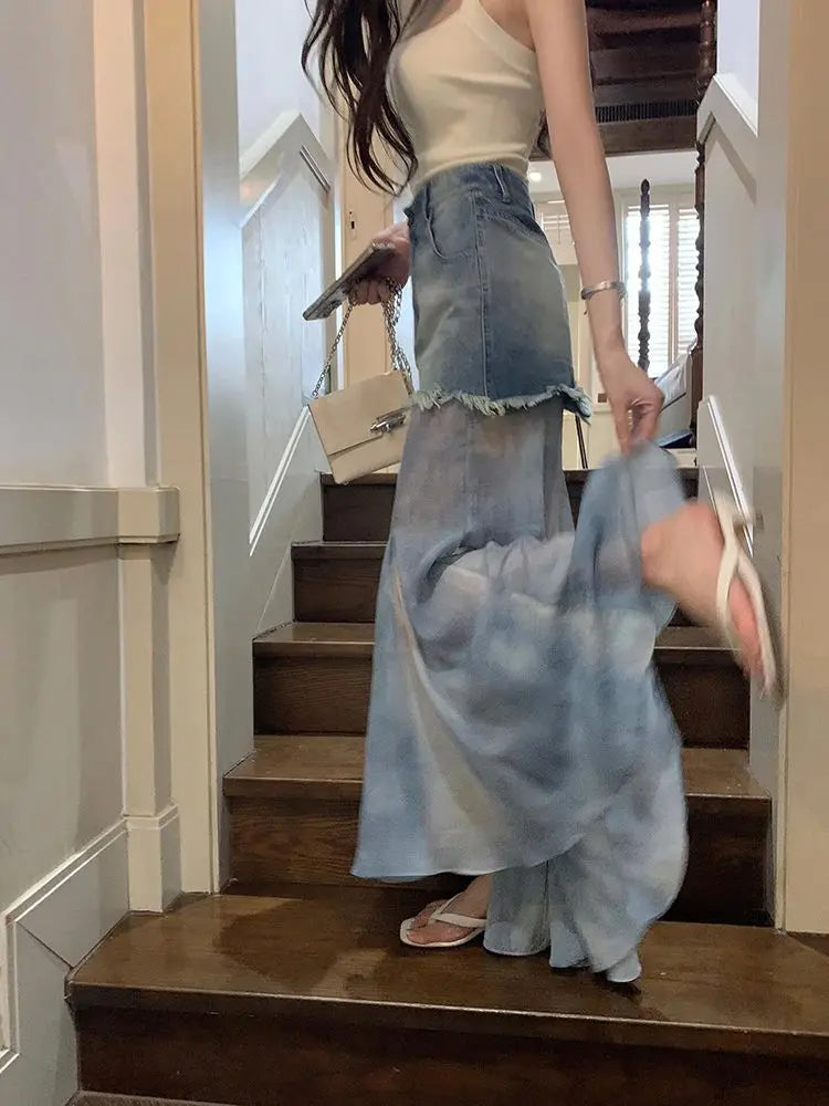 GETADME Summer New Retro Denim 2025 Patchwork Mesh Semi Transparent Fishtail Design High Waisted Ruffled Skirt for Slimming Effect