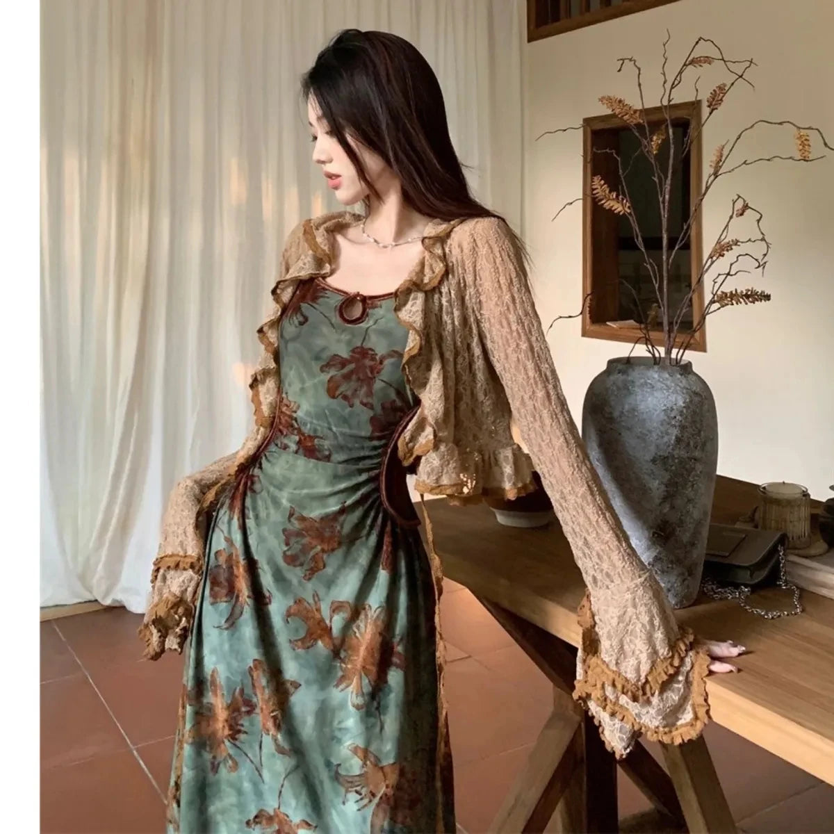 GETADME Sweet Two Piece Sets Womens Outfit Lace Up Patchwork Vintage Floral Maxi Dress Ruffles Chic Vein Loose Cropped Cardigan
