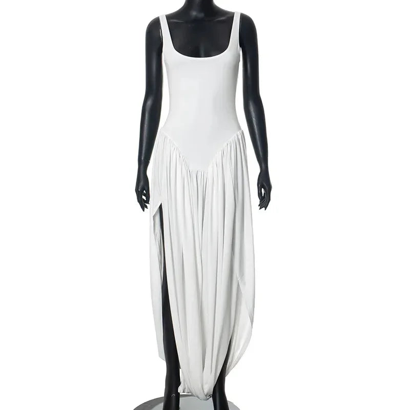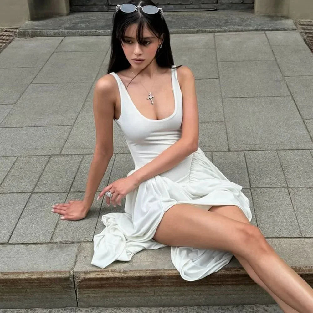 GETADME Talenza Mesh Patchwork Slit Mini Dress Women's New Solid Color Vest High Waist Dress Sexy Smocked Sleeveless Slim Mini Dress
