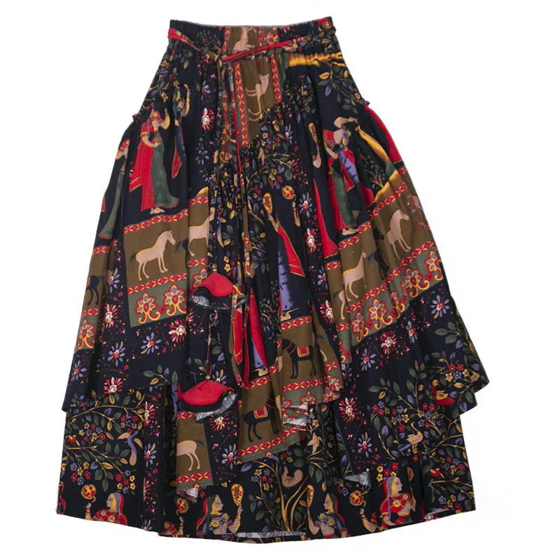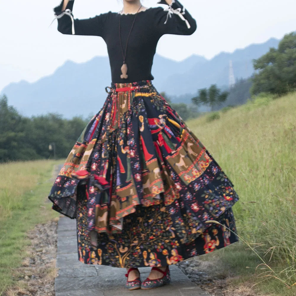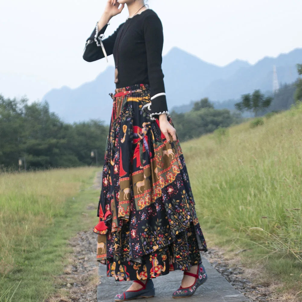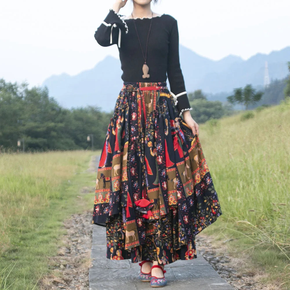GETADME TIYIHAILEY Long Maxi Women Cotton Linen Skirts Print Flower A-line Elastic Waist Winter S-2XL Irregular Chinese 2025 New