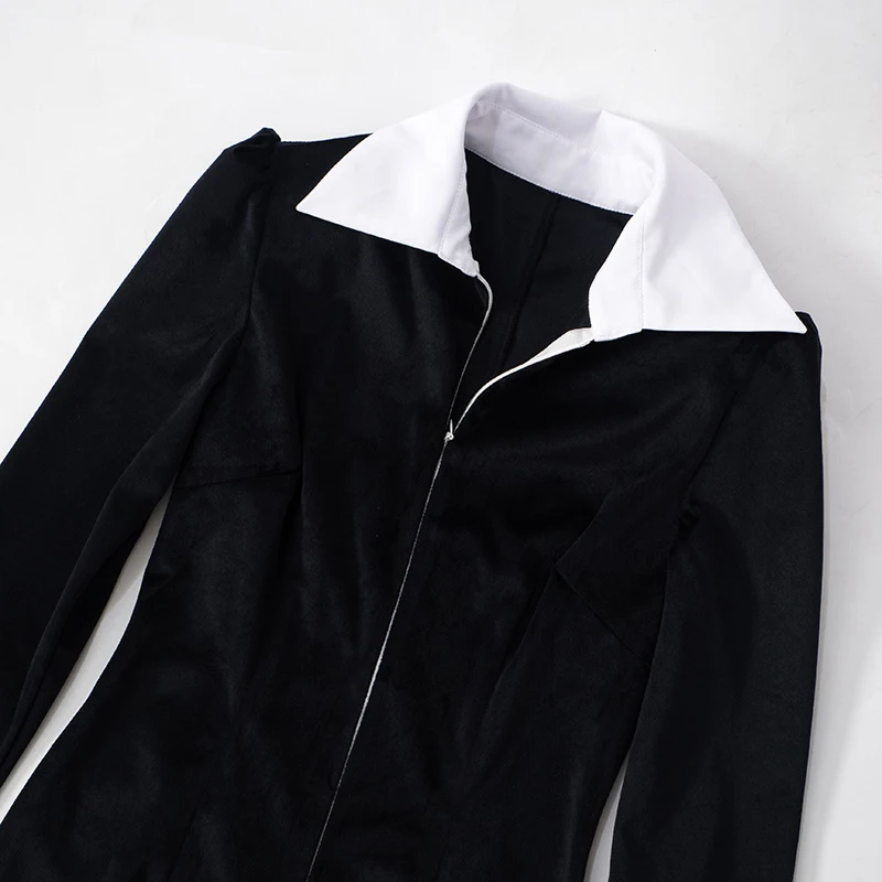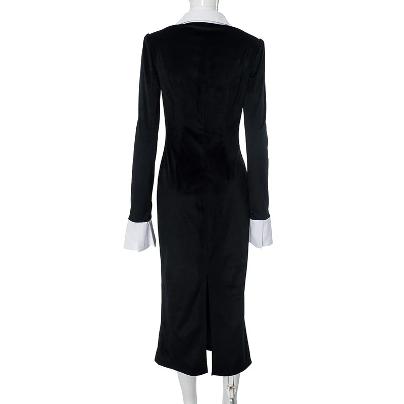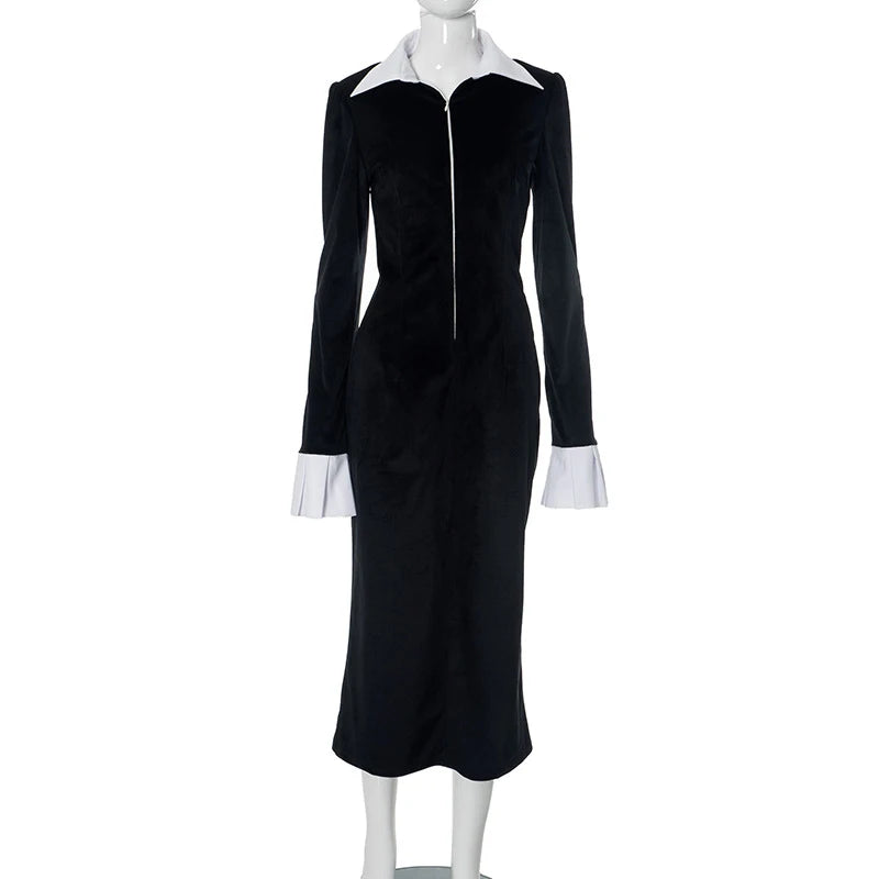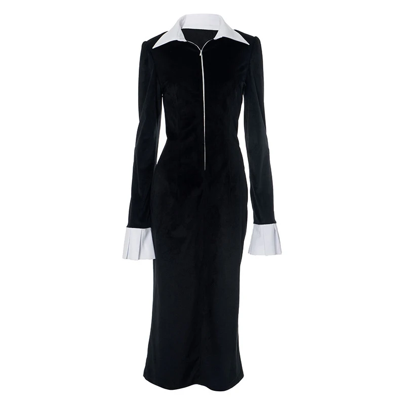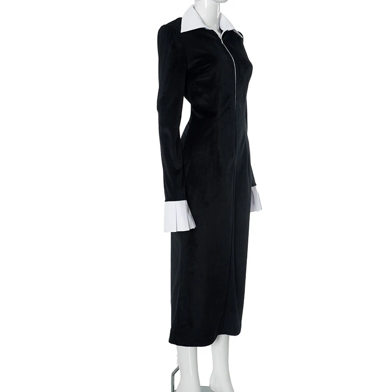 GETADME Trendy Color Blocking Lapel Long-sleeved Zip Up Elegant Long Bodycon Dresses Patchwork Velvet Fall&Winter Party Evening Gowns