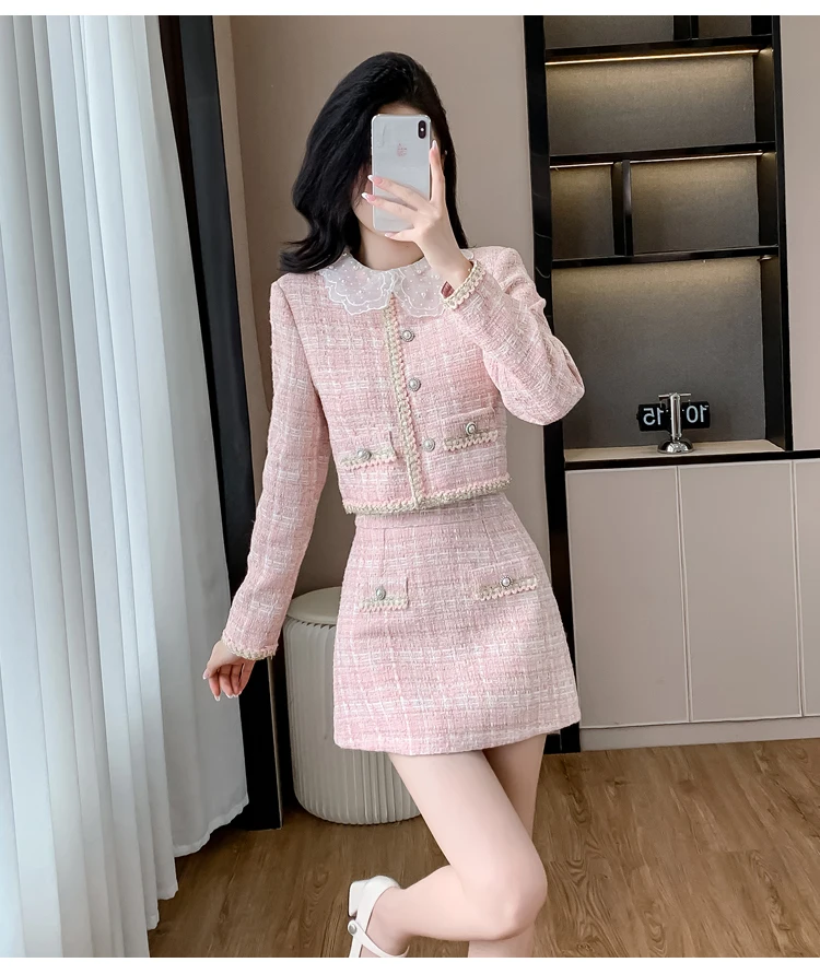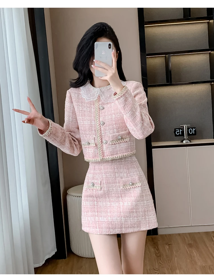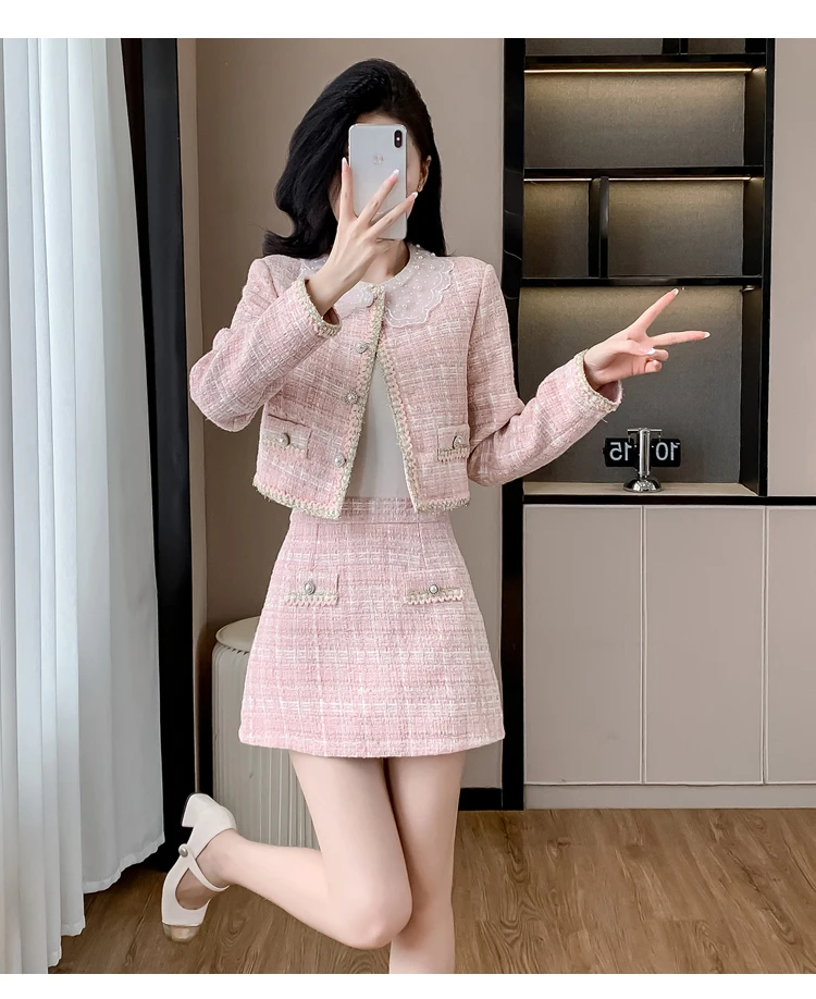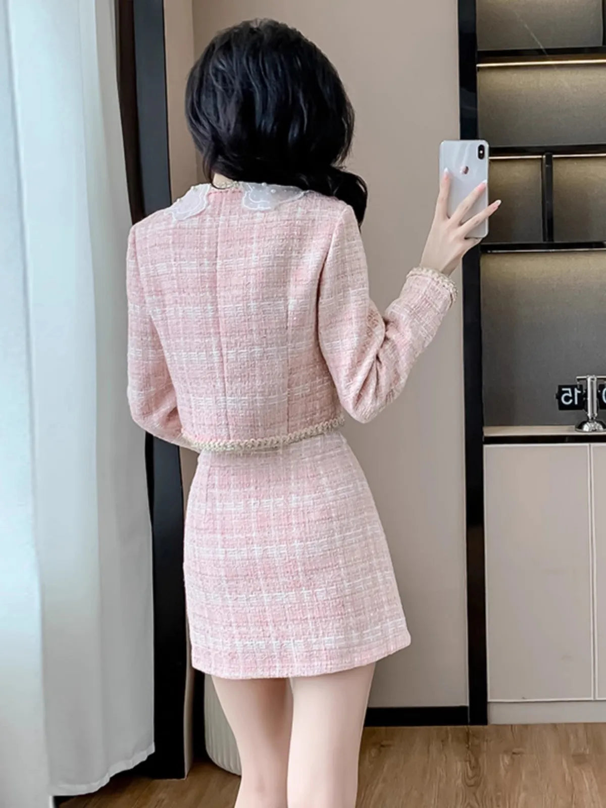 GETADME Tweed Jacket and Skirt Set for Women French Vintage Small Fragrance Two Piece Outfits Coat and Skirt High Quality