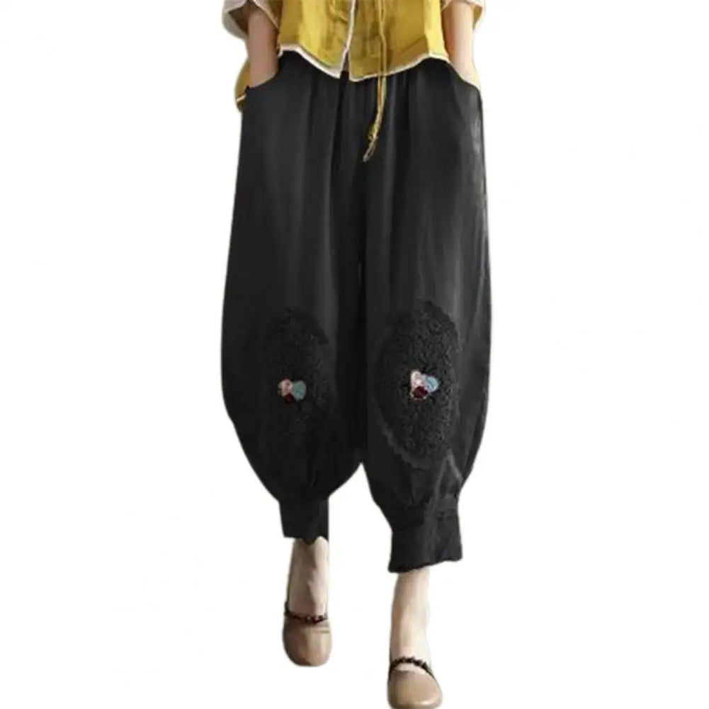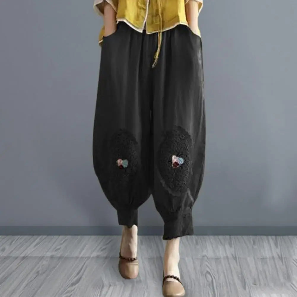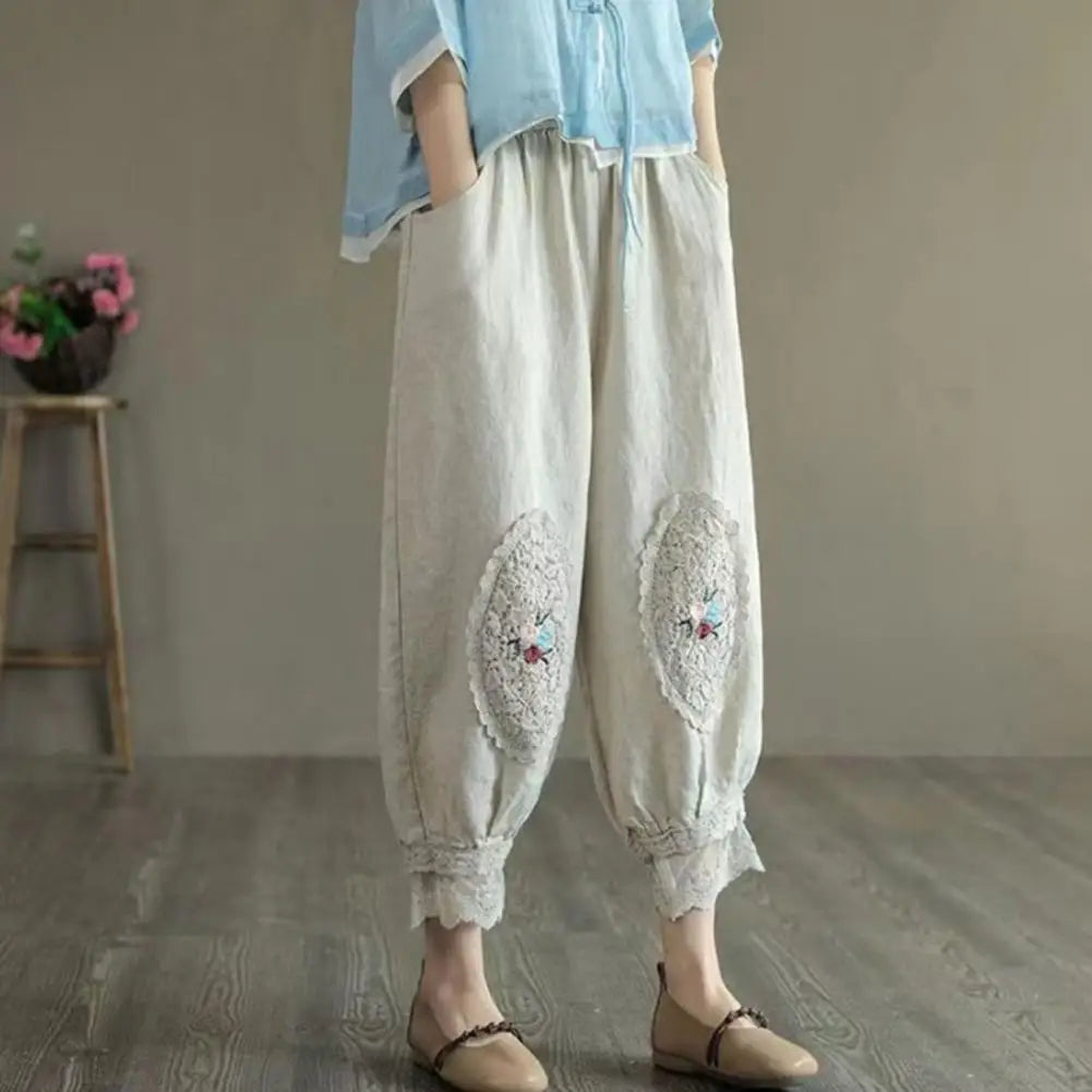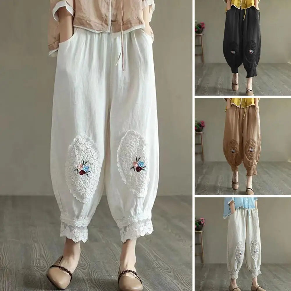 Women Pants Elastic Waist Pocket Lace Patchwork Flower Embroidery Daily Wear Solid Color Plus Size Mid-calf Length Ninth Pants Female Clothes