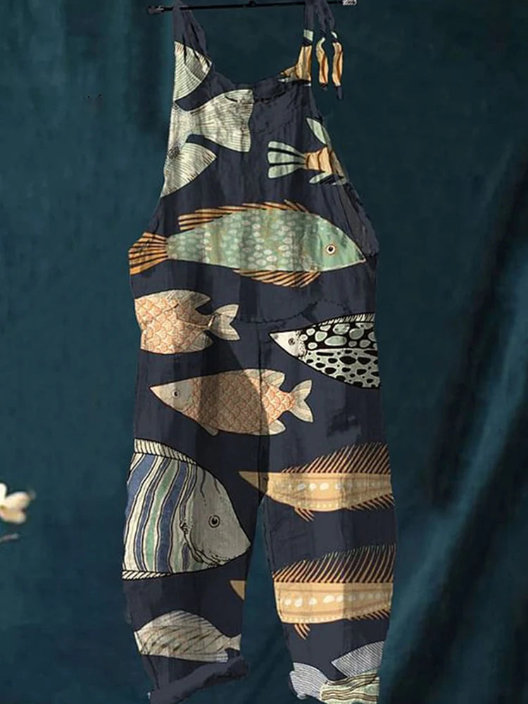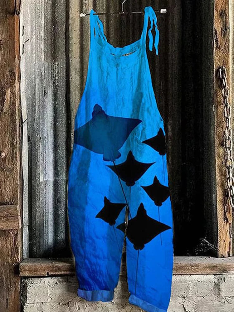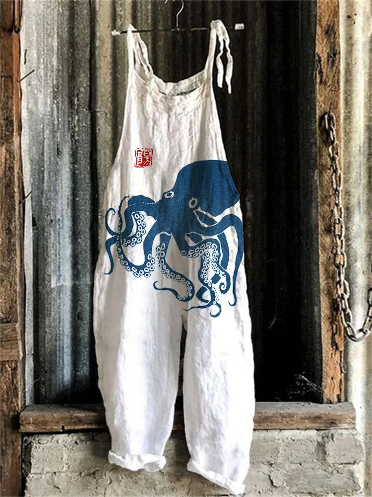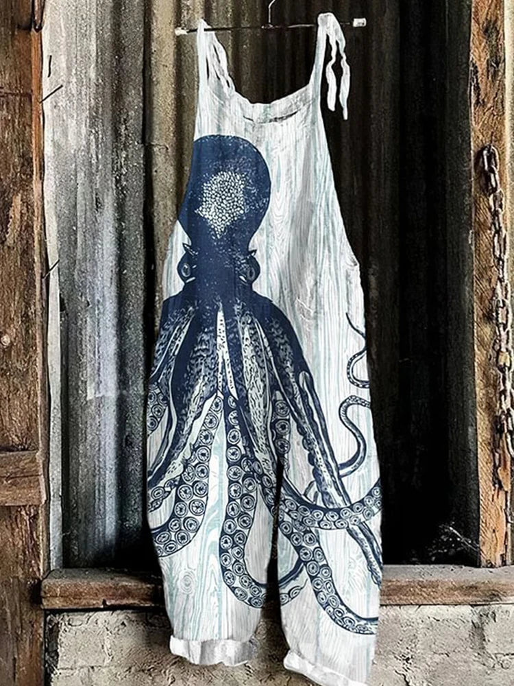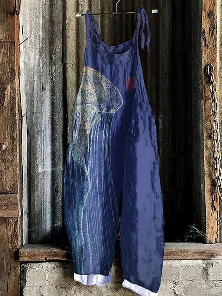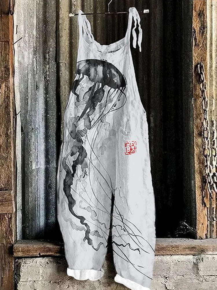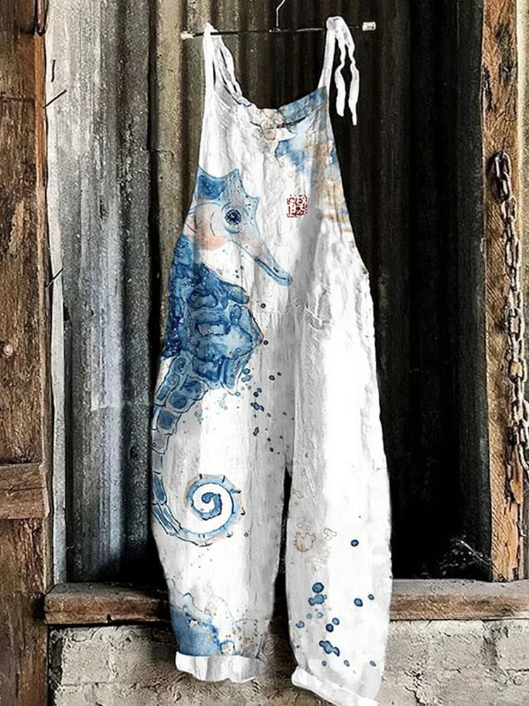 GETADME Vintage Japanese Seahorse Print Holiday Beach Casual Loose Strap Romper Shorts Urban Street Trend Loose Romper Pants S-5XL