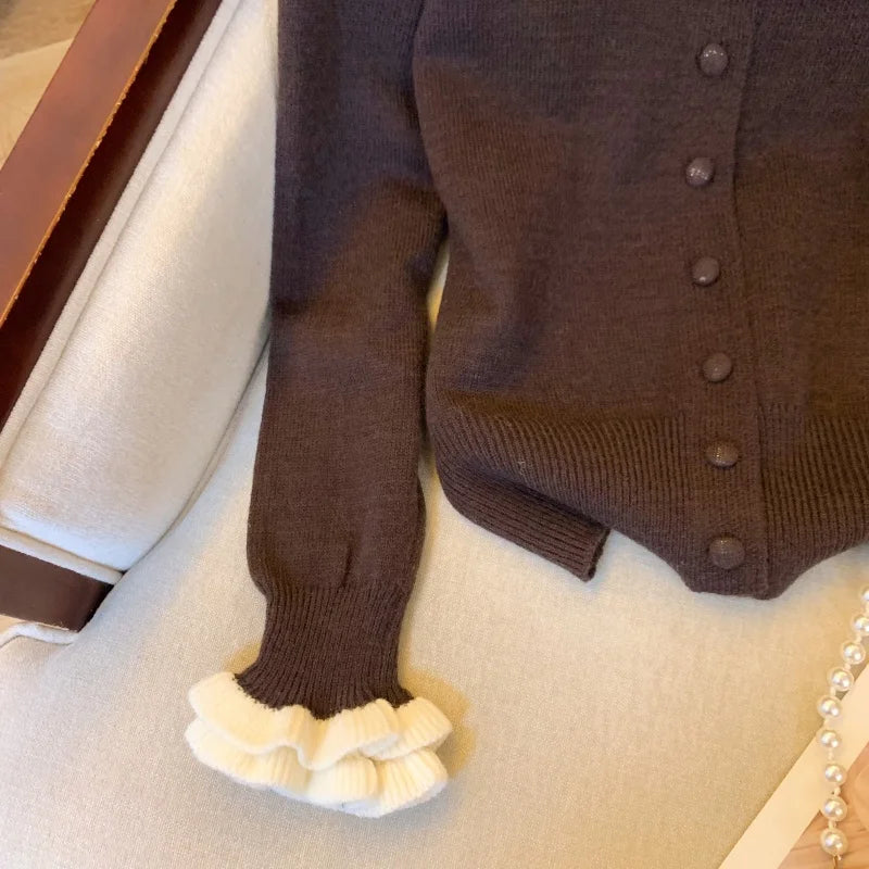 GETADME Vintage Ruffles Knitted Cardigan Women Harajuku Cropped Sweater Outerwears Korean Patchwork Knitwears Winter Long Sleeve Jumpers