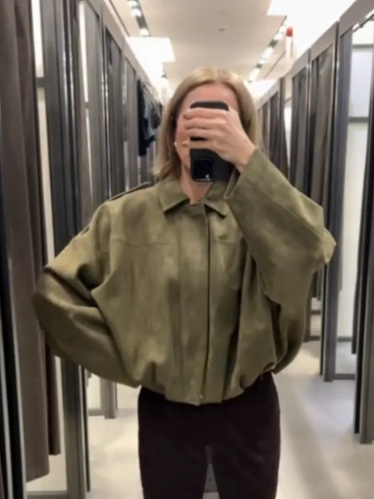 GETADME Vintage Suede Zipper Jacket Women Casual Oversized Lapel Green Long Sleeve Bomber Coats 2025 Spring Street Chic Outerwear Tops