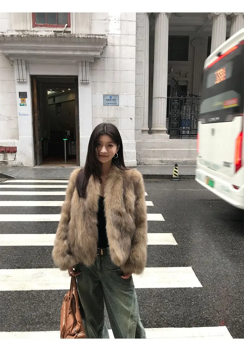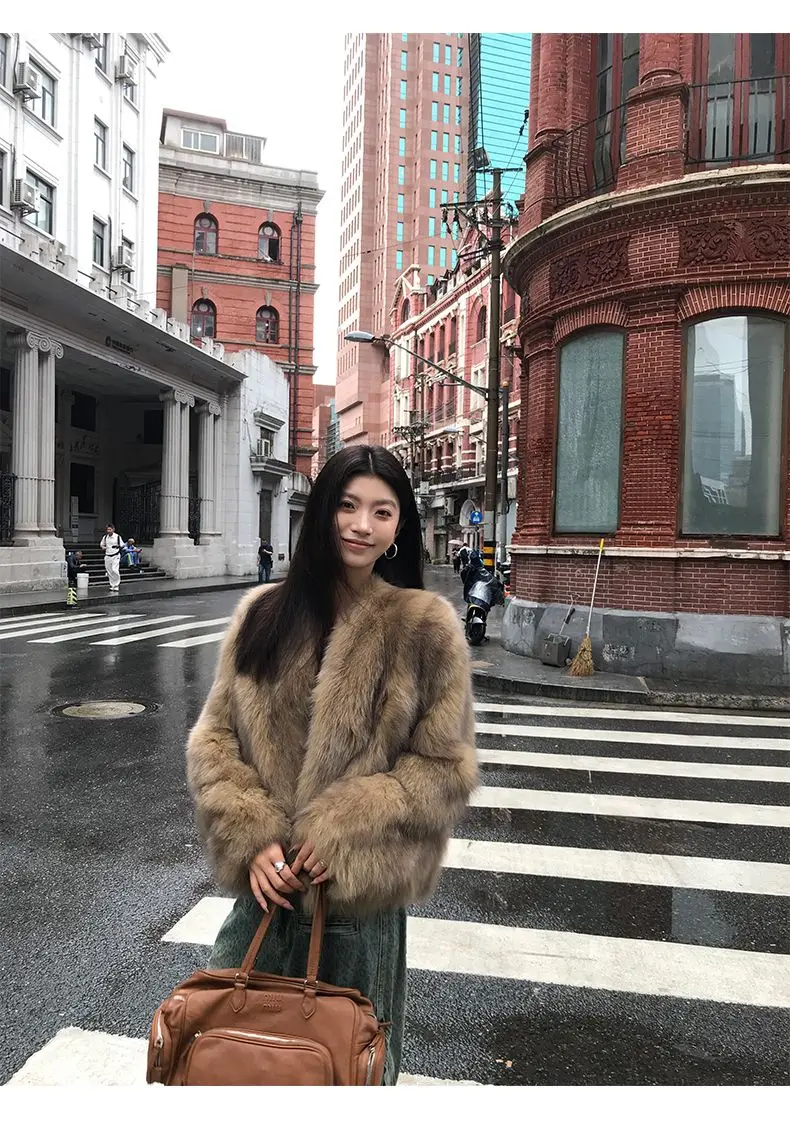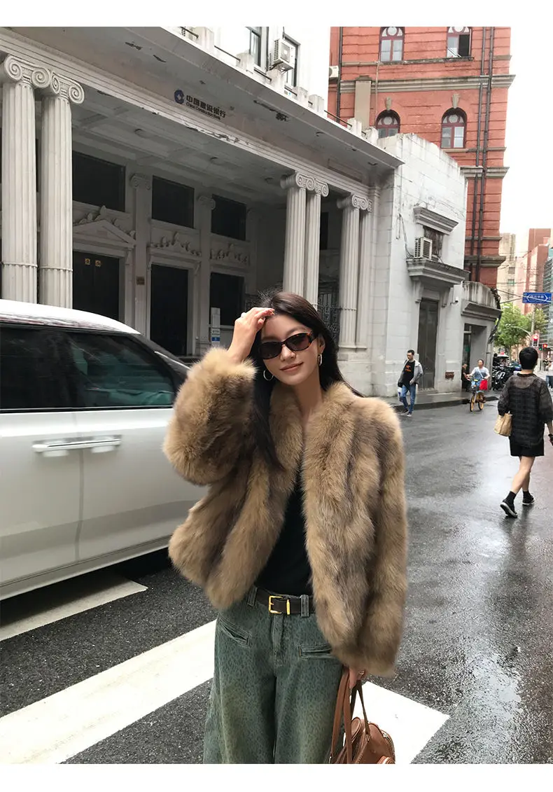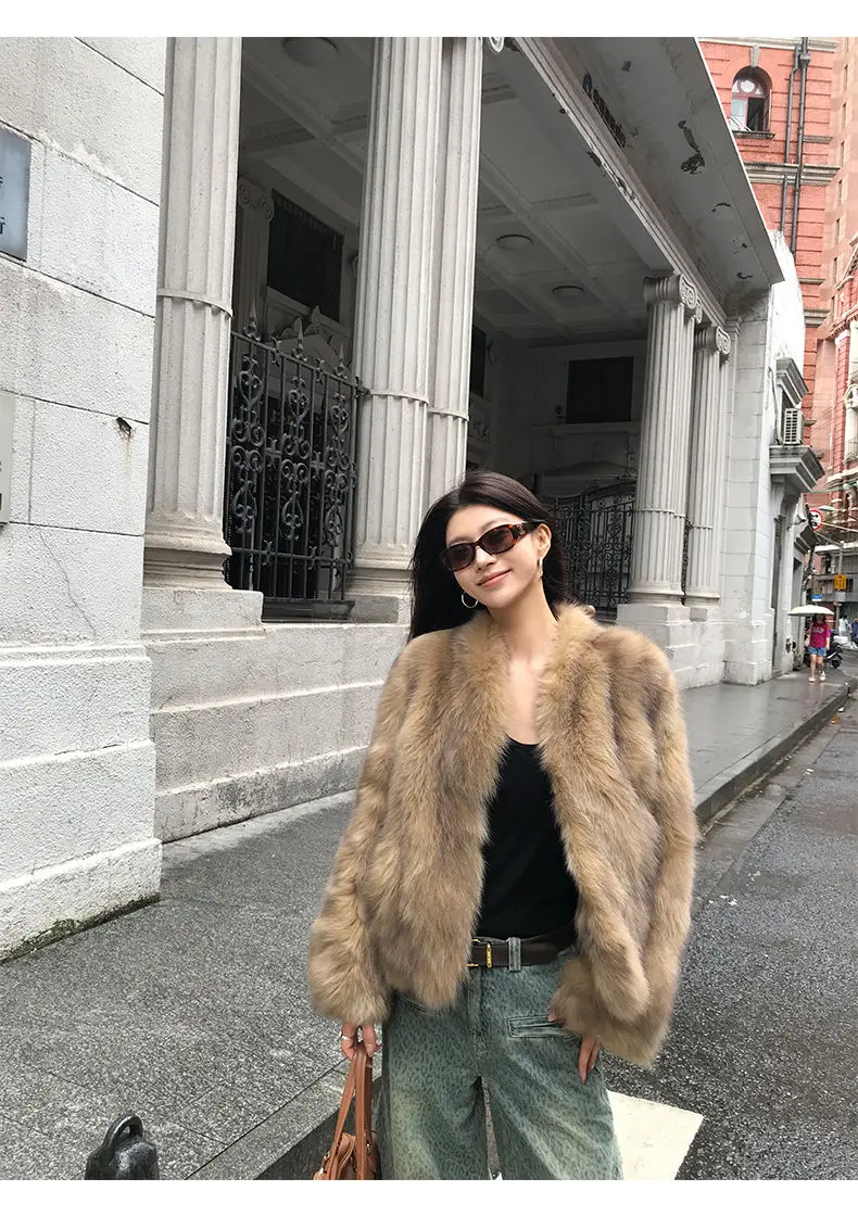 GETADME Winter Coat New Korean Fashion High End Fox Fur Coat for Women Winter Clothes V-neck Warm Brown Short Fur Jackets Women Tops