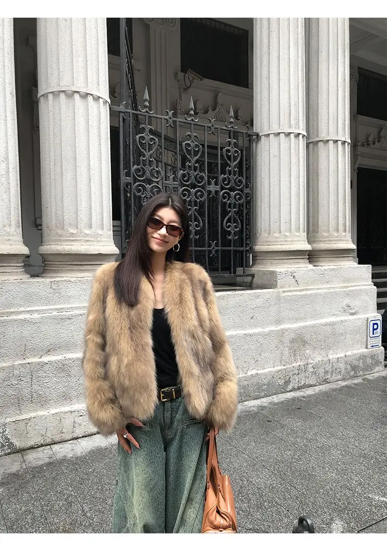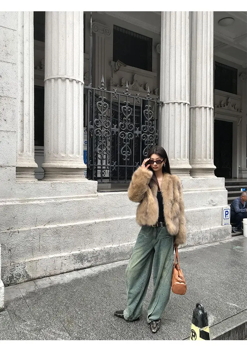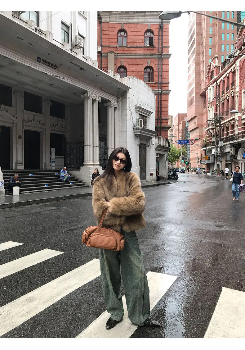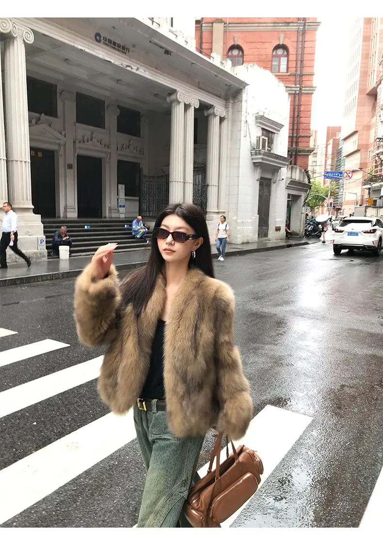 GETADME Winter Coat New Korean Fashion High End Fox Fur Coat for Women Winter Clothes V-neck Warm Brown Short Fur Jackets Women Tops