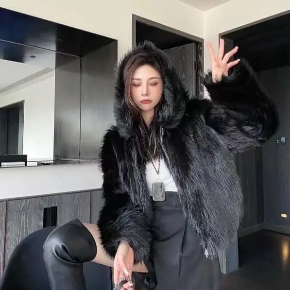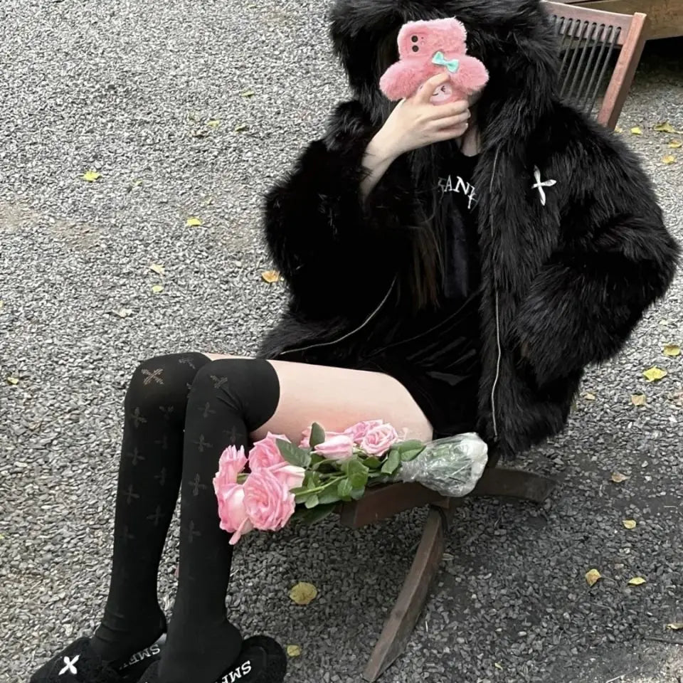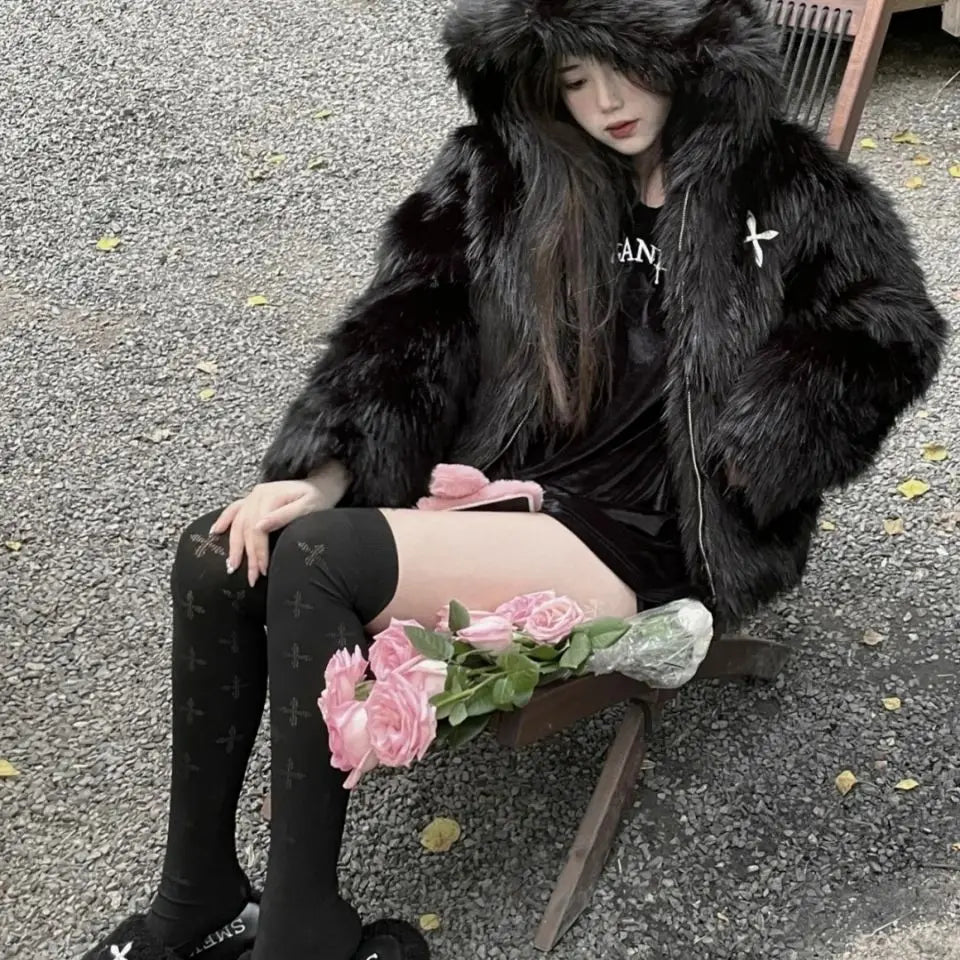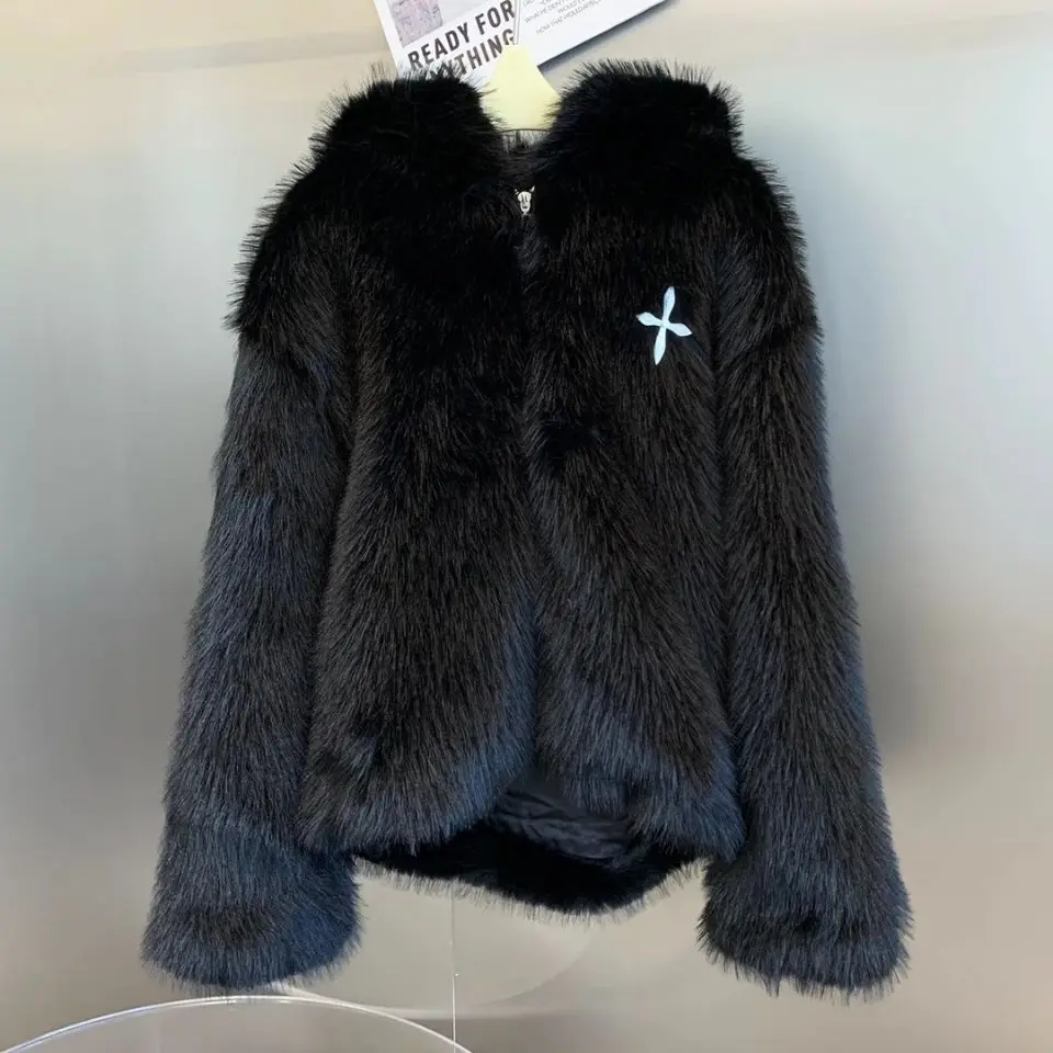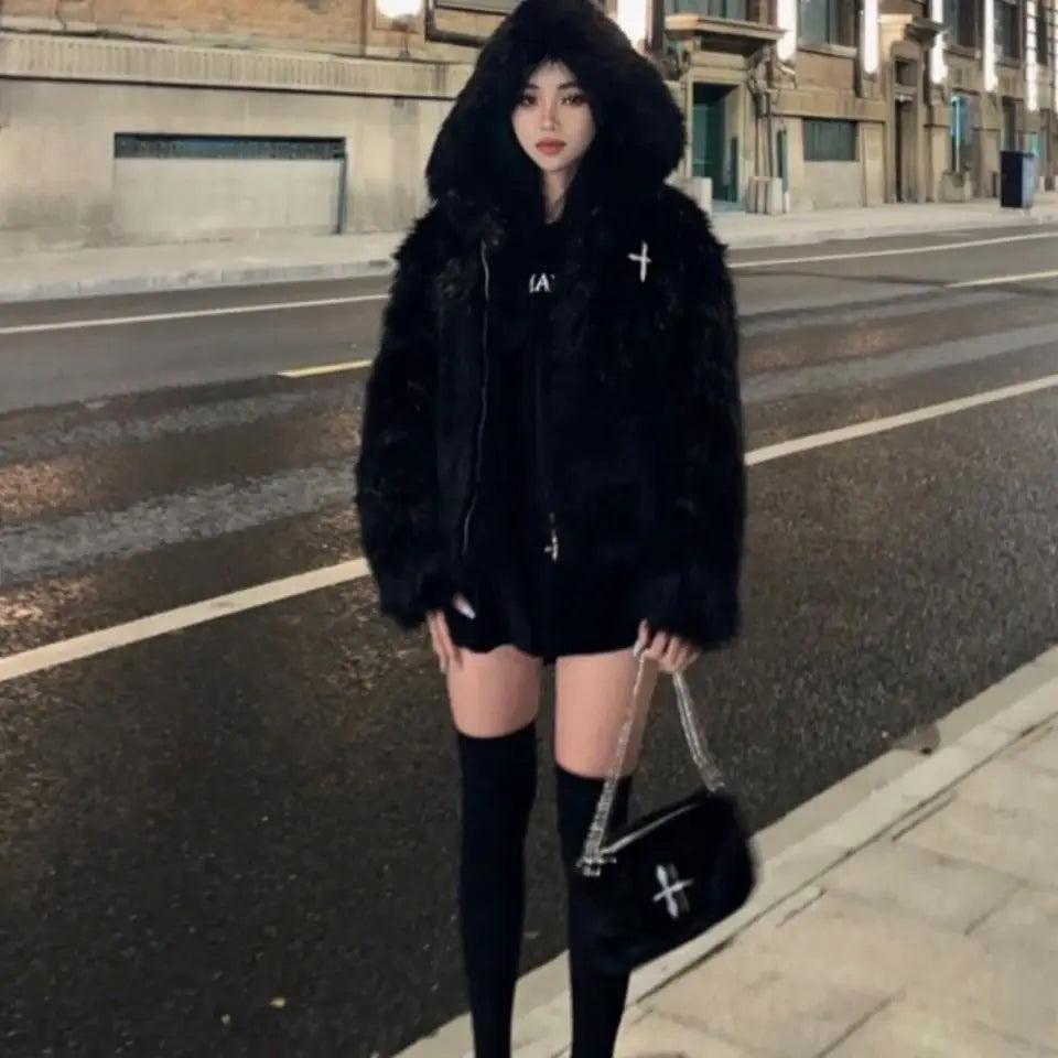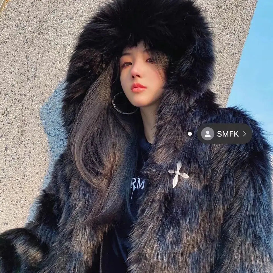 GETADME Winter Hooded Faux Mink Fur Jacket Song Snowman Hoodies Imitation Fox Fur Cross Embroidery Bomber Coat Fluffy Parkas Cardigan