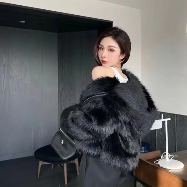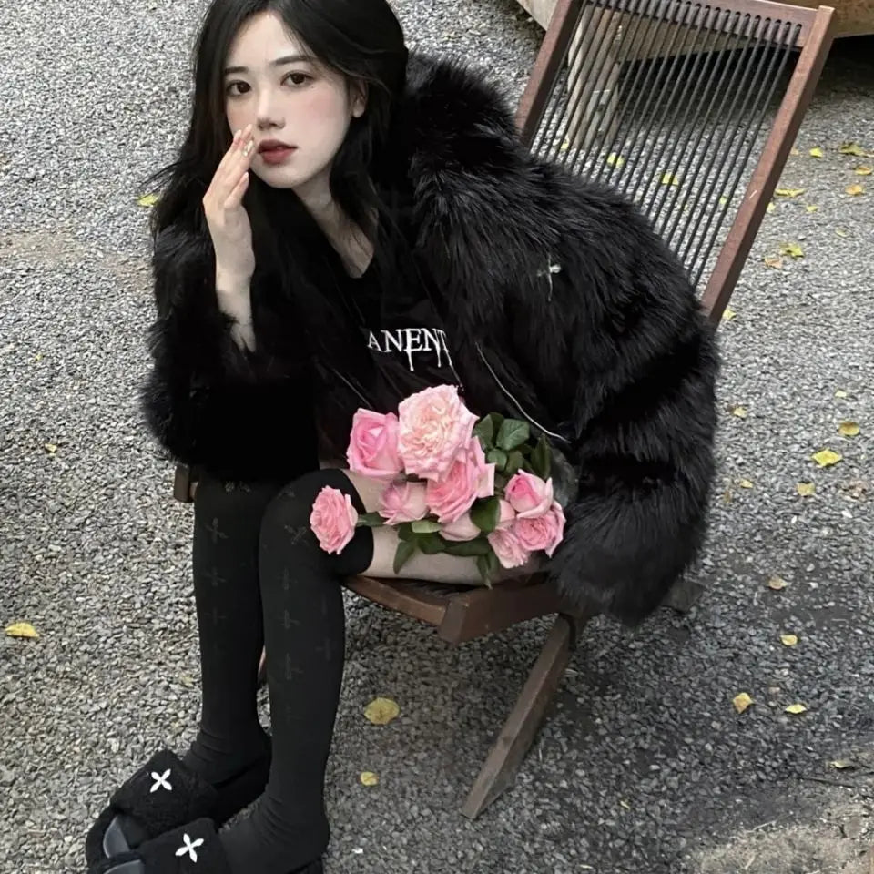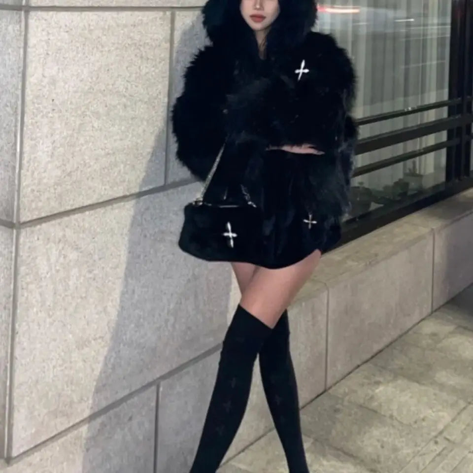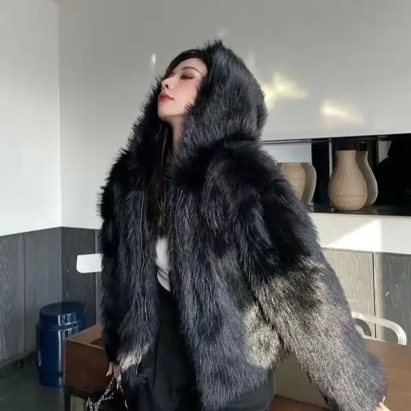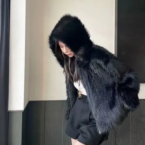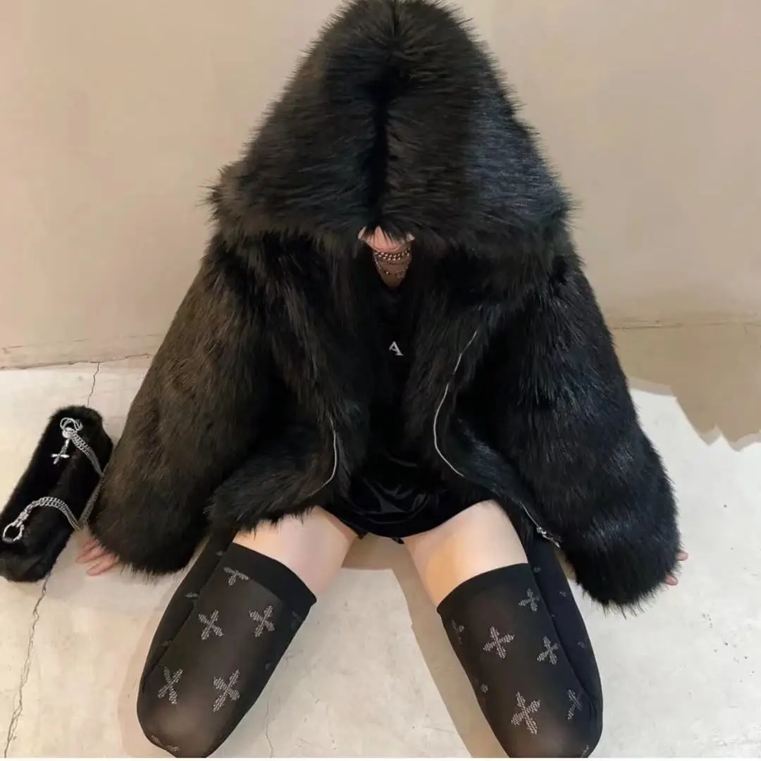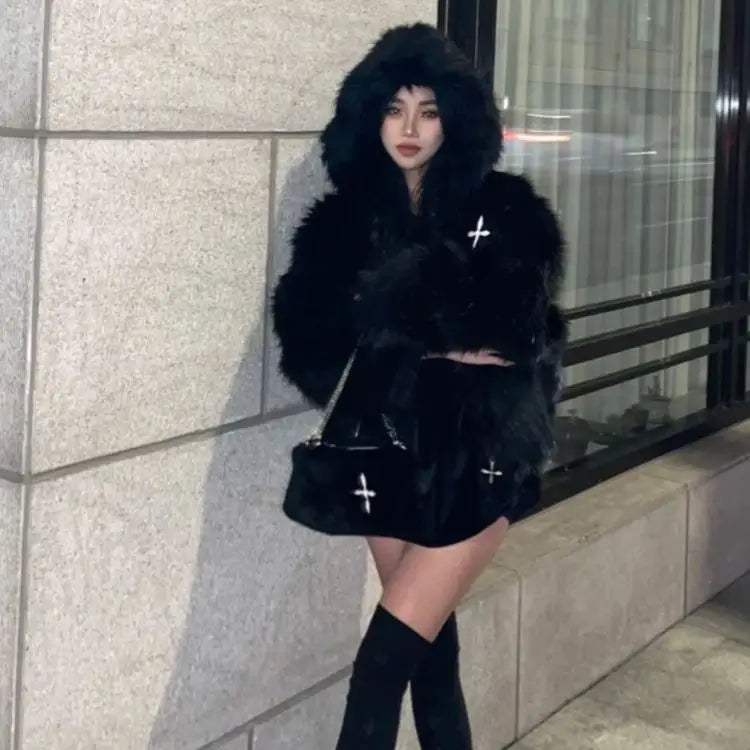 GETADME Winter Hooded Faux Mink Fur Jacket Song Snowman Hoodies Imitation Fox Fur Cross Embroidery Bomber Coat Fluffy Parkas Cardigan