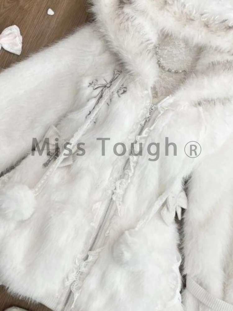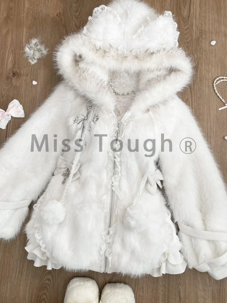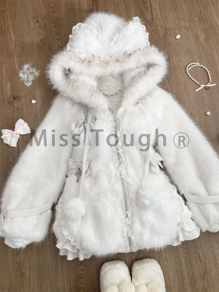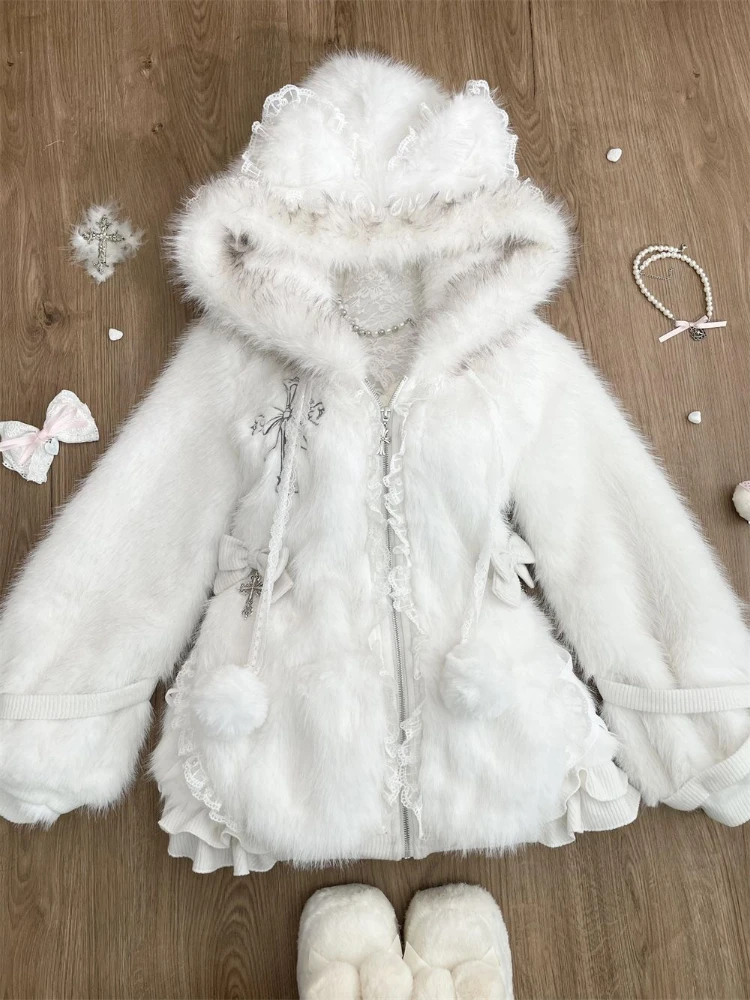GETADME Winter Sweet Plush Warm Hooded Sweet Coat New Japanese Fashion Princess White Cute Zipper Jacket Designer Slim Harajuku Clothing