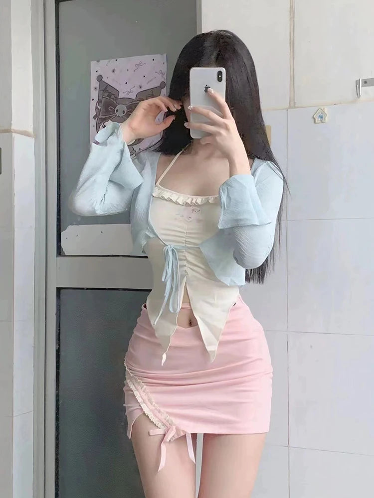Getadme -Women 2000s Japanese Fashion Gyaru Hot Sexy Fairy Core Outfits 3 Piece Set Kawaii Camisole + Coquette Bolero + Mini Micro Skirt