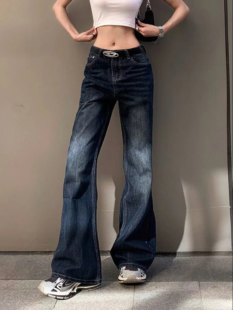 GETADME Women Classical Gyaru Japanese Jeans Harajuku Y2K Streetwear Low Rise Flare Denim Pants 2000s Vintage Bell-Bottom Trousers Kpop