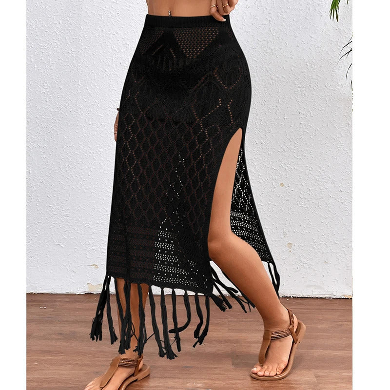 GETADME-Women Knitted Texture Sarong Skirts Sexy High Slit Tassel Cover-Up Beach Summer Vacation Wrapped Skirt Bikini Cover Up
