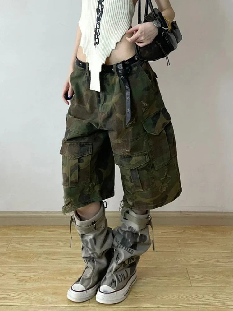 GETADME Women Short Jeans Green Camouflage American Vintage Y2K Straight Streetwear Wide Leg Pants High Waist Female Summer Denim Shorts