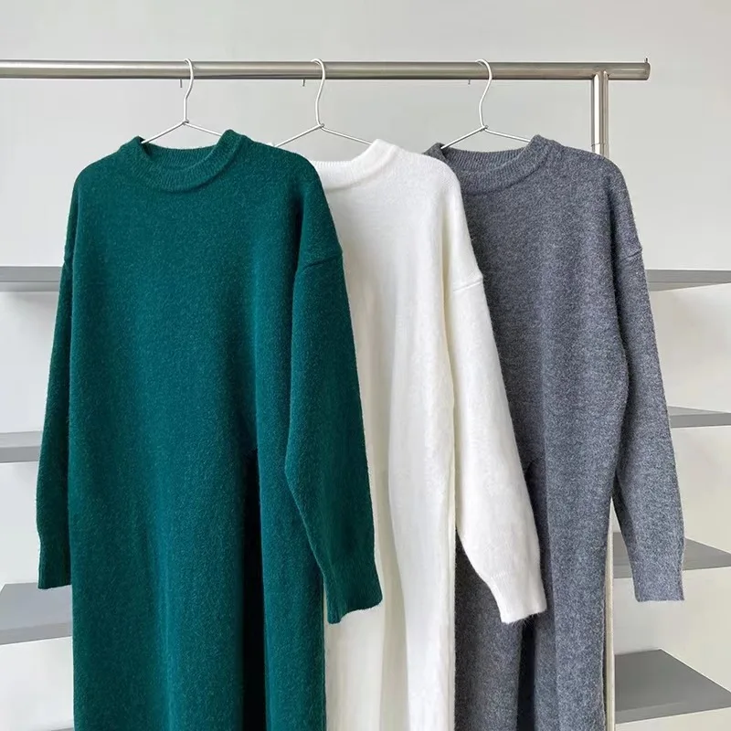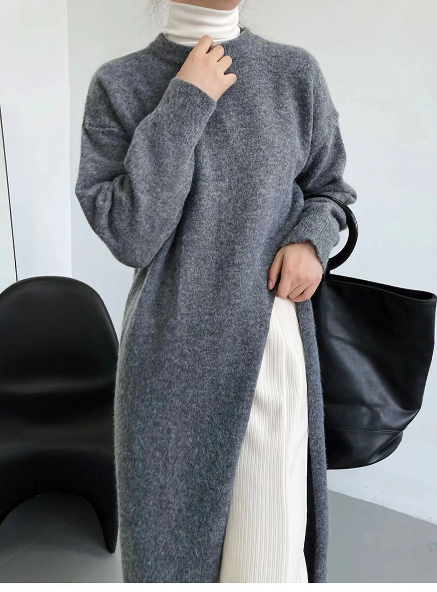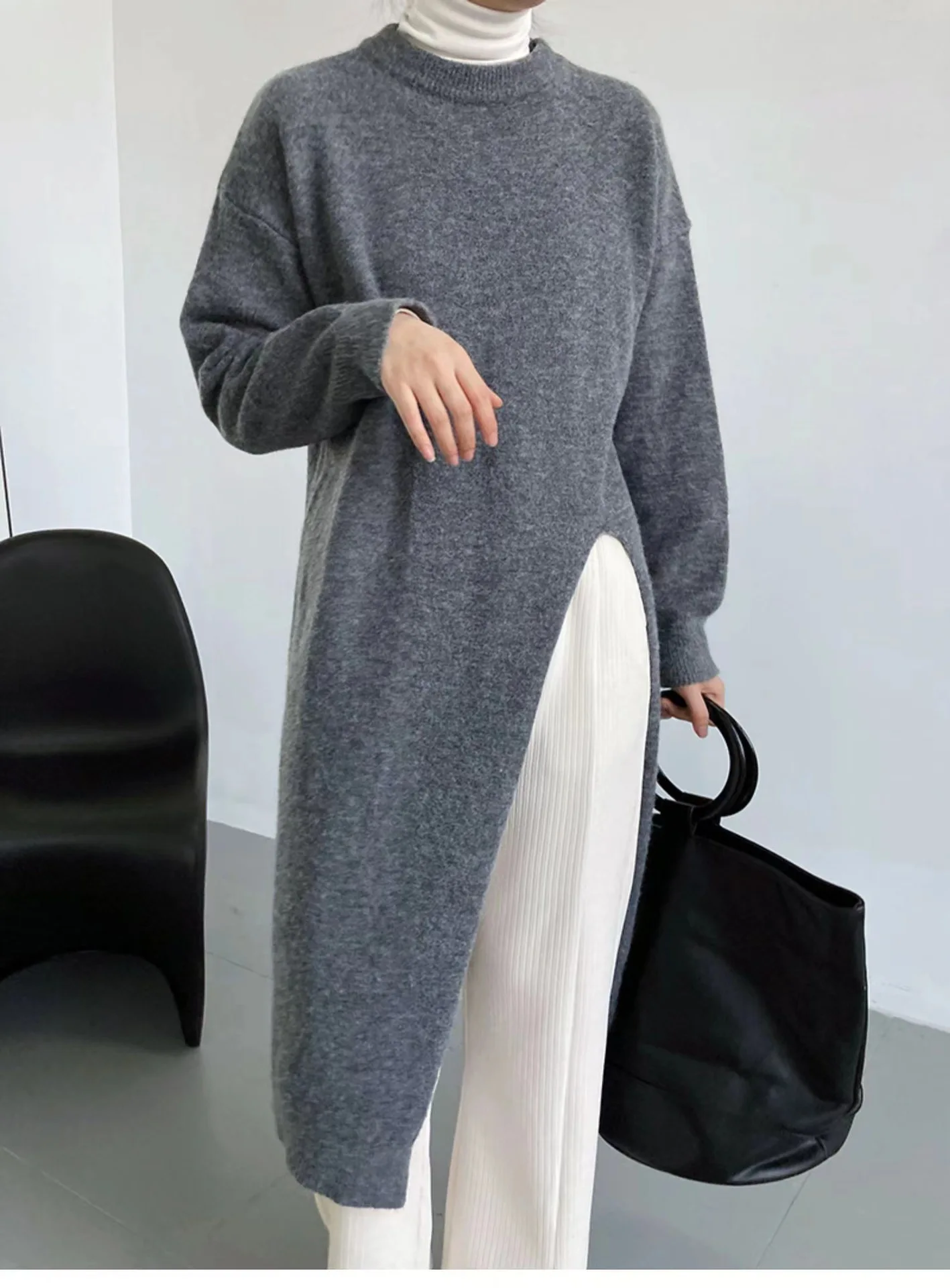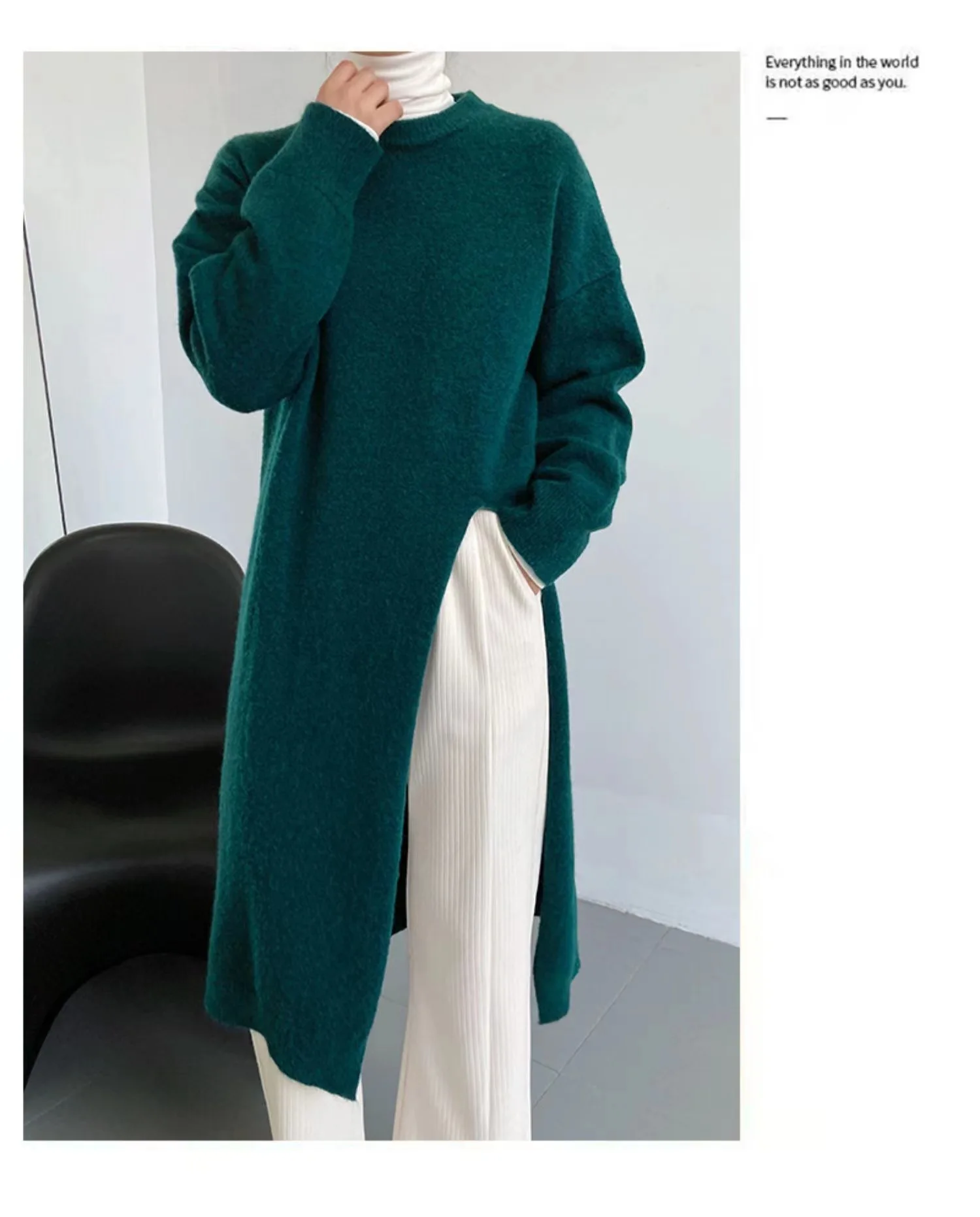 GETADME Women Side Split Long Maxi Knitted Sweaters Casual Female Loose O-Neck Long Sleeve Knitwear Pullovers PYMY-MY718745
