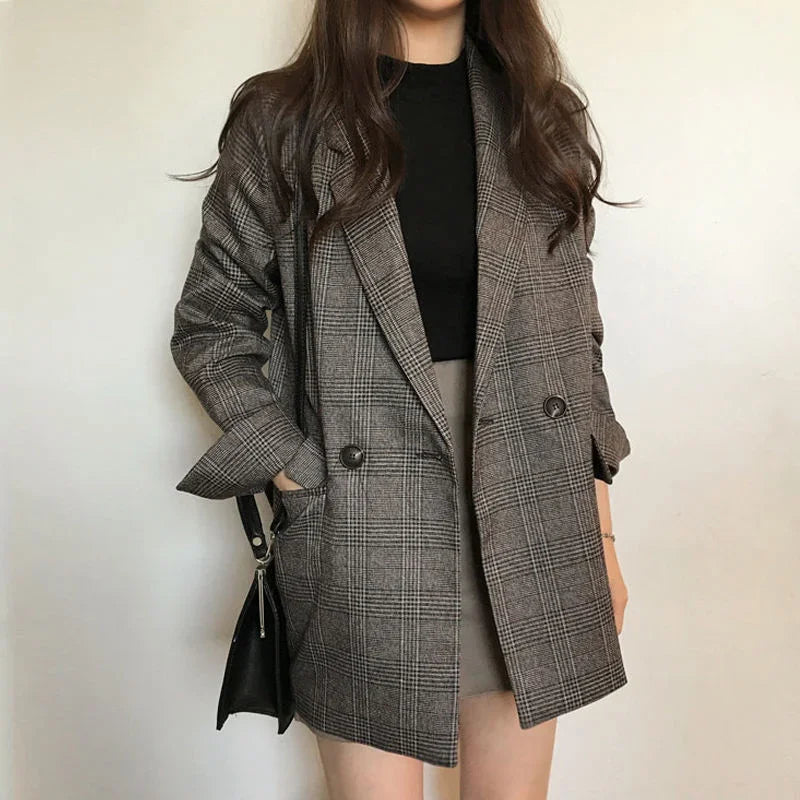 GETADME Women Winter Plaid Blazers Coats Korean Fashion Elegant Solid Thick Jacket Female Double Breasted Office Lady Long Overcoat