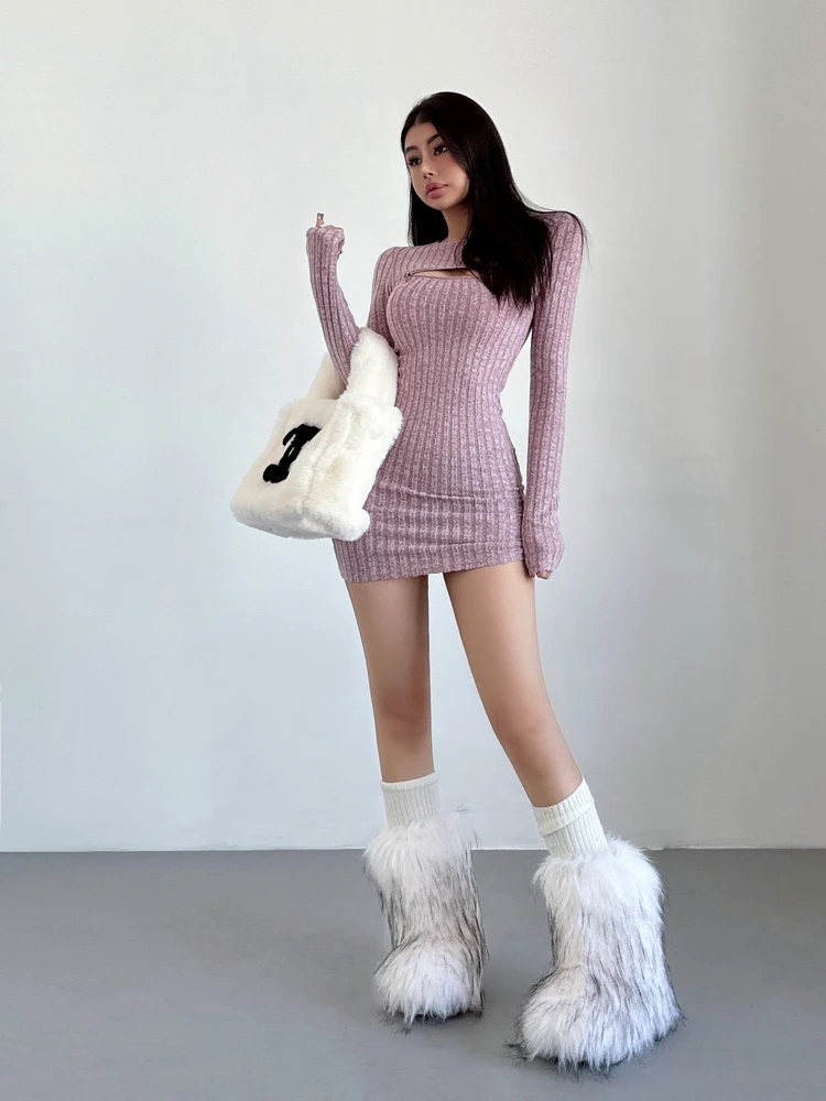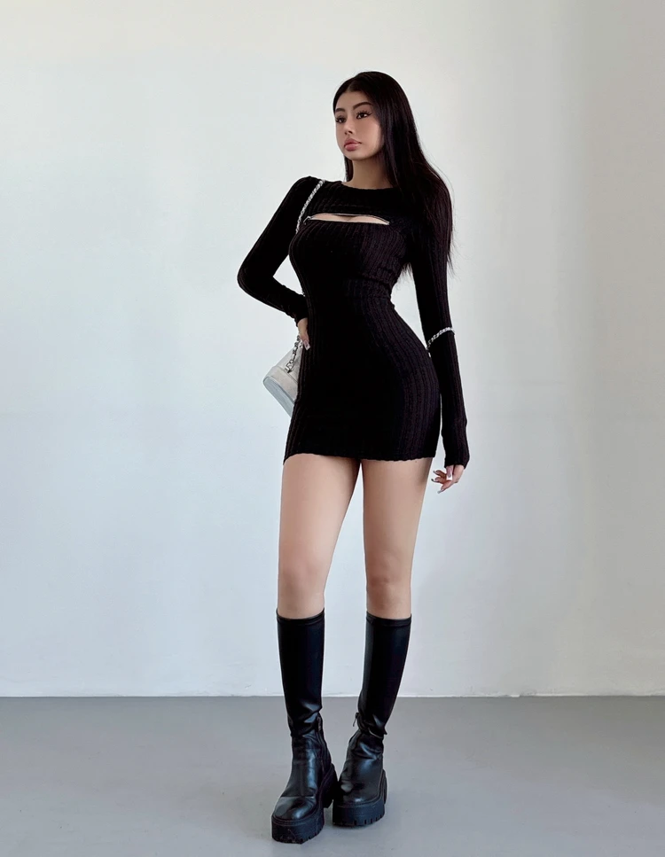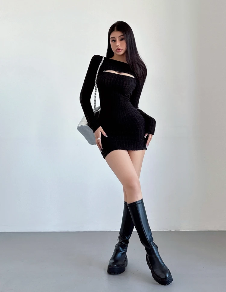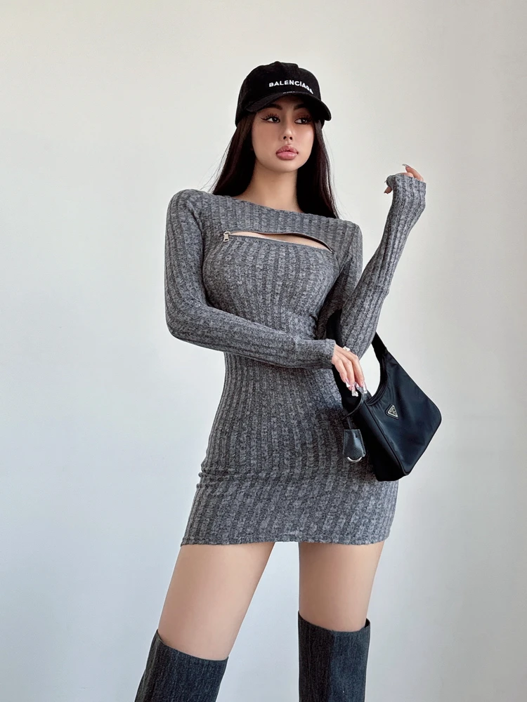 GETADME WOMENGAGA Chest Zipper Knitted Dress Elegant Women's 2025 Spring Slim Long Sleeve Wrapped Hip Mini Dress Sweater Tops 2025 D0DO