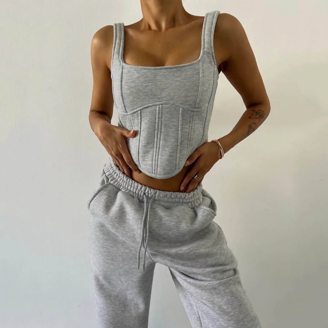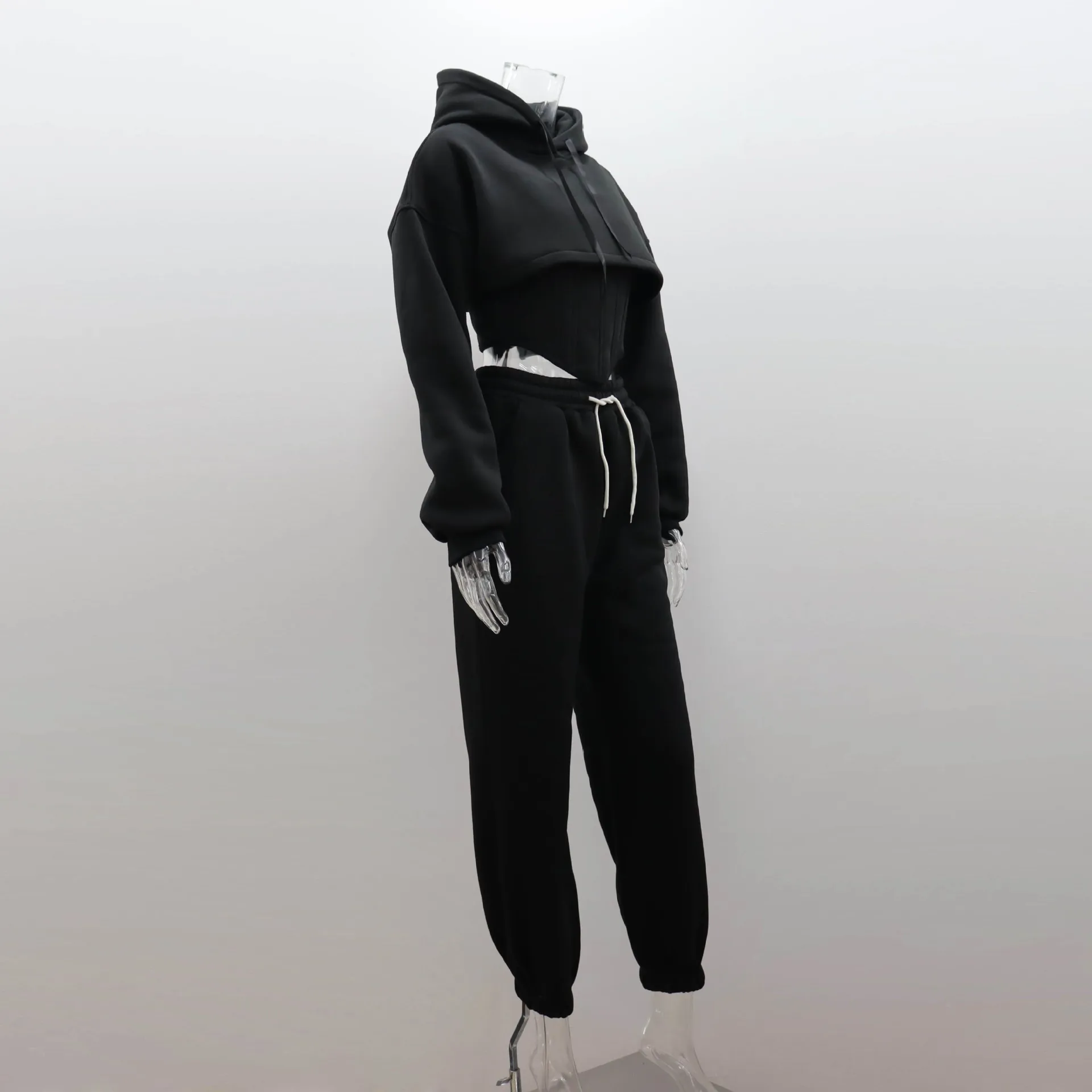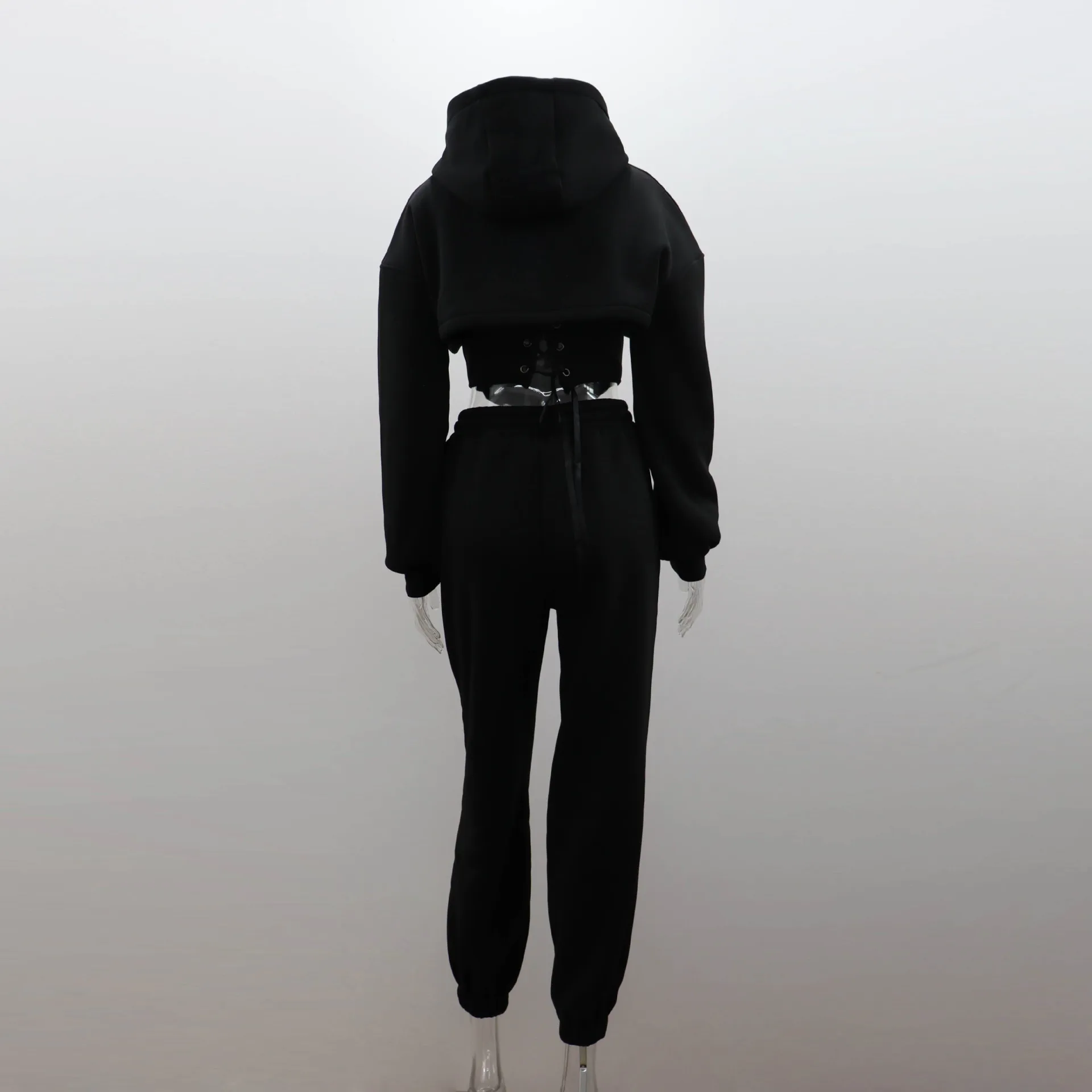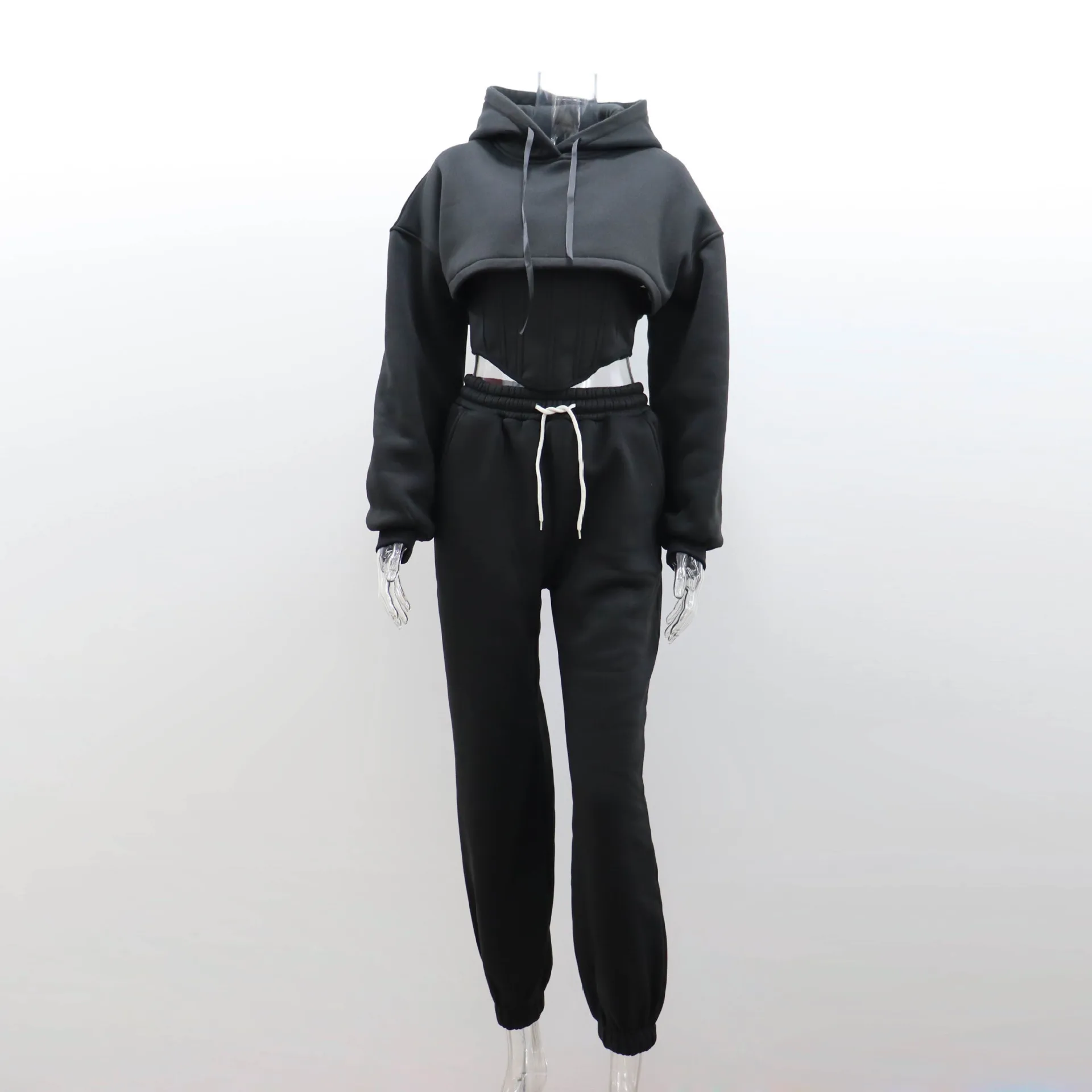 GETADME Women's casual sweatpants set 2025 autumn and winter new belted hooded short hoodie corset of three-piece trousers