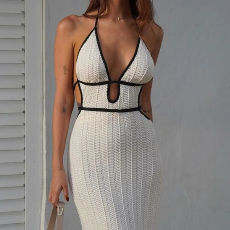 Women's Sexy See-Through Backless Tie Up Long Dress Summer Beach Holiday Swimsuit Cover Up Ladies Knitted Tunic Slip Dress