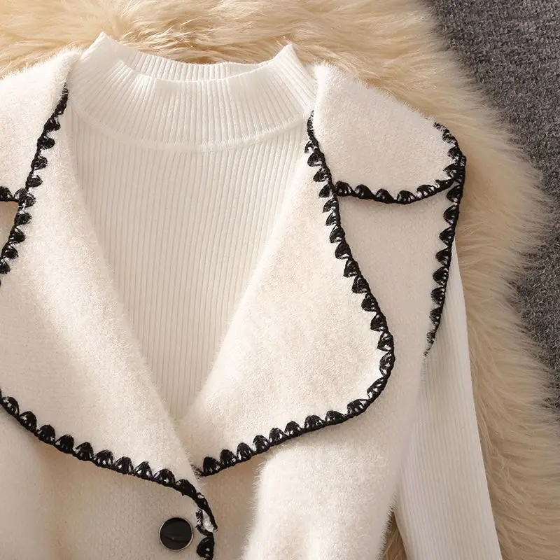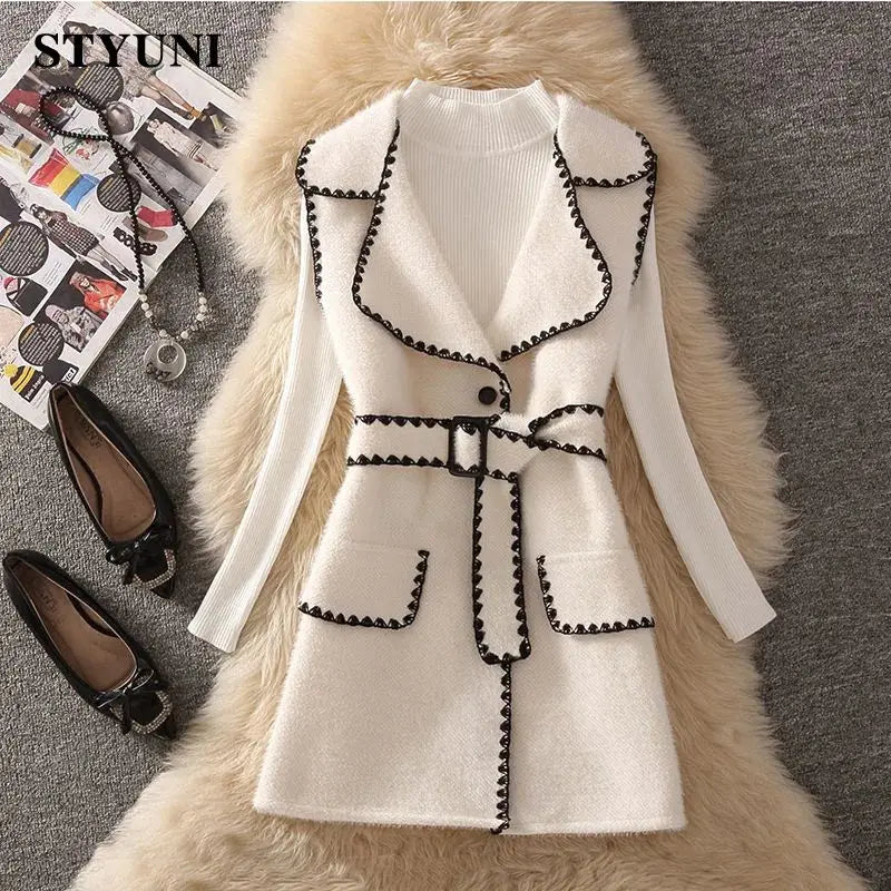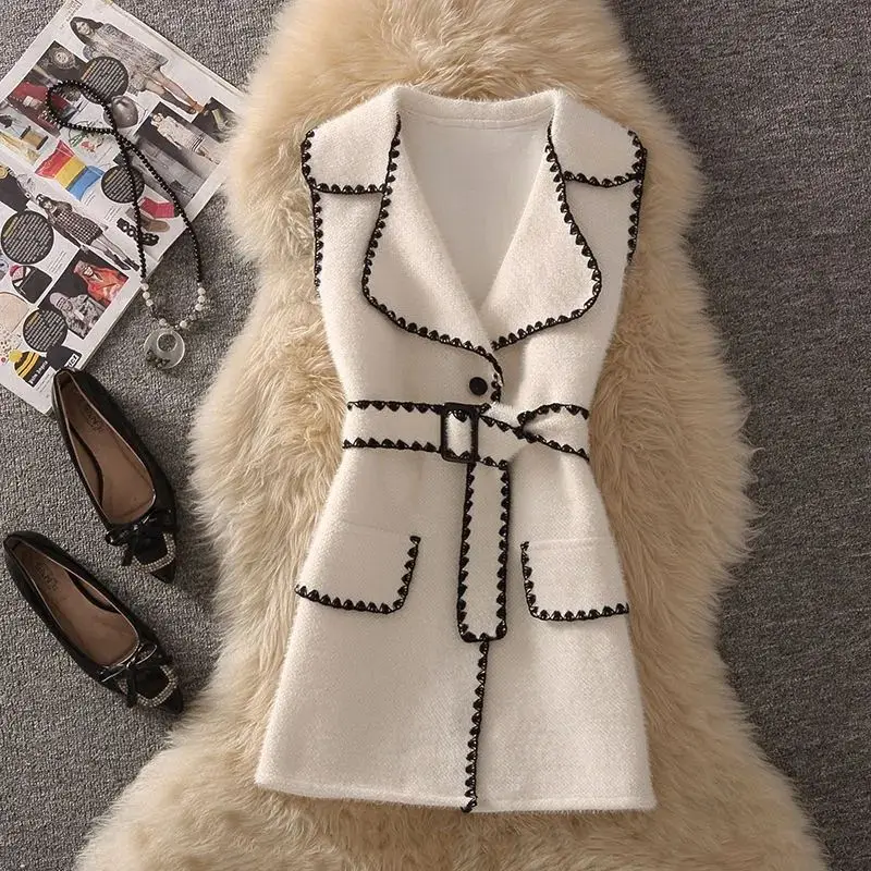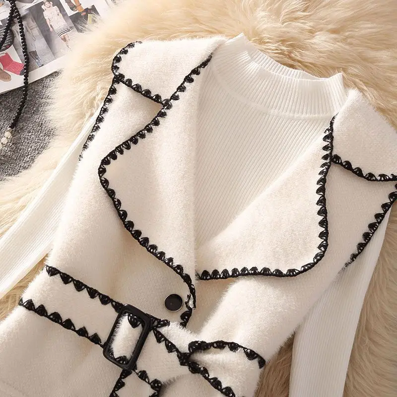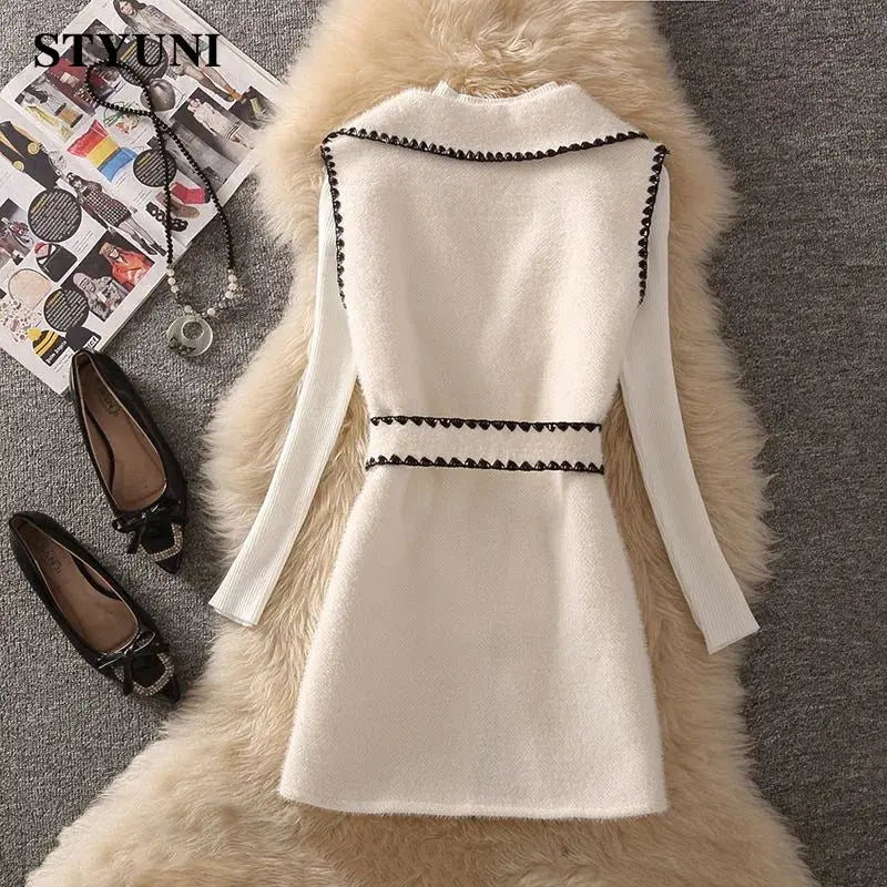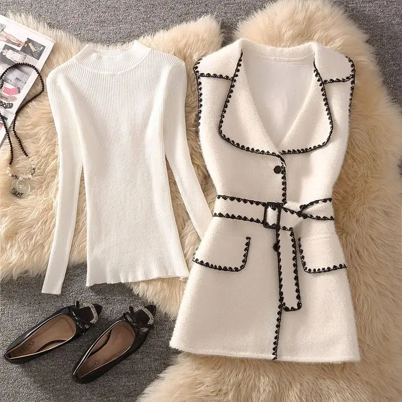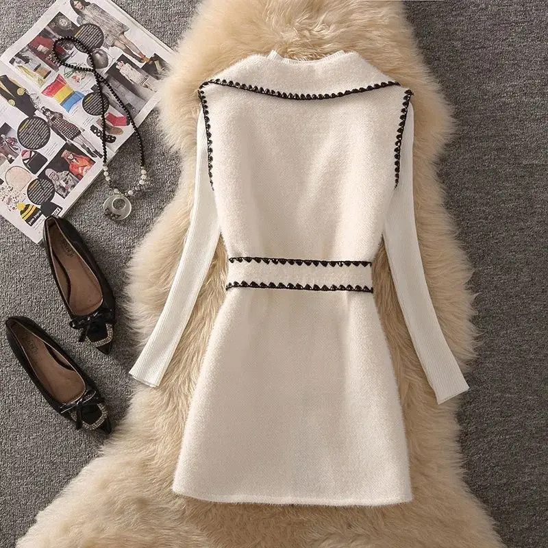 GETADME Woolen Vintage Turn-Down Collar High Waist With Belt Dresses Knitted Sweaters Pullover Two-piece Set Womens Dress Suit 2025