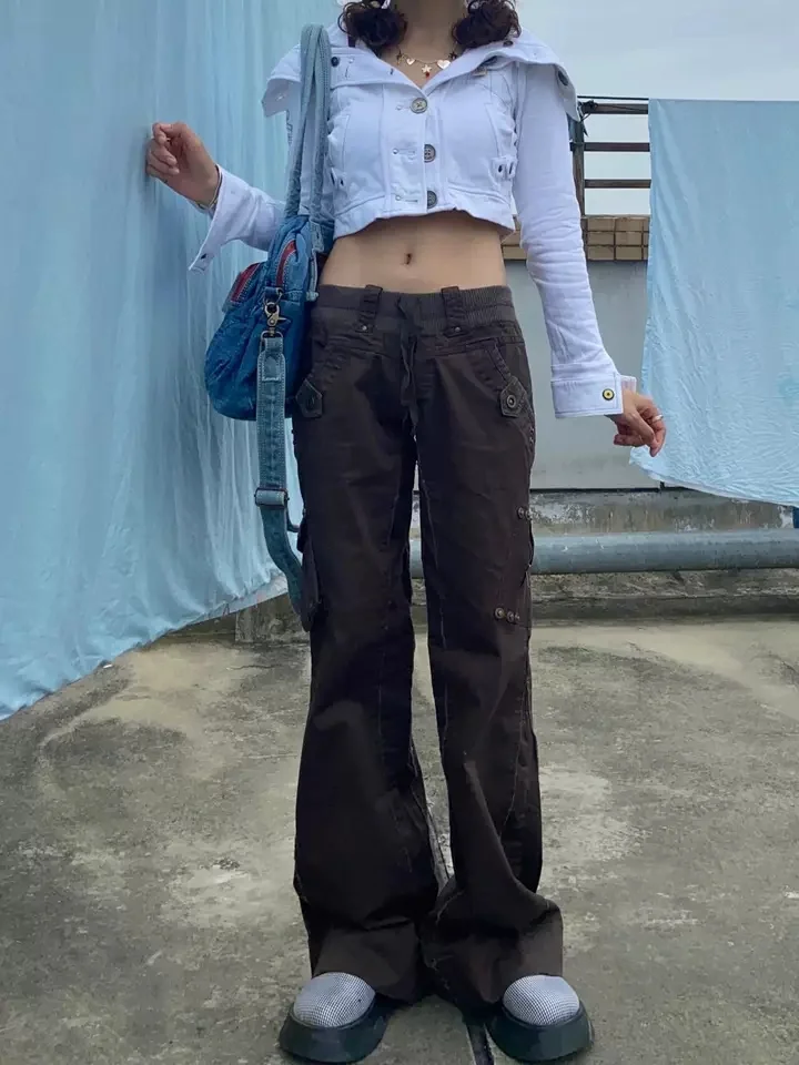 GETADME Y2K Aesthetic Brown Spliced Flare Jeans Women High Waist Streetwear Cargo Jean Pants Vintage Denim Trousers Grunge Pantalones