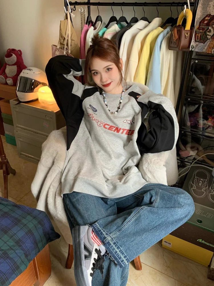 GETADME Y2K Vintage Gray Sweatshirts Women Hip Hop Retro Streetwear Long Sleeve Hoodie Female Harajuku Kpop Patchwork Letter Top