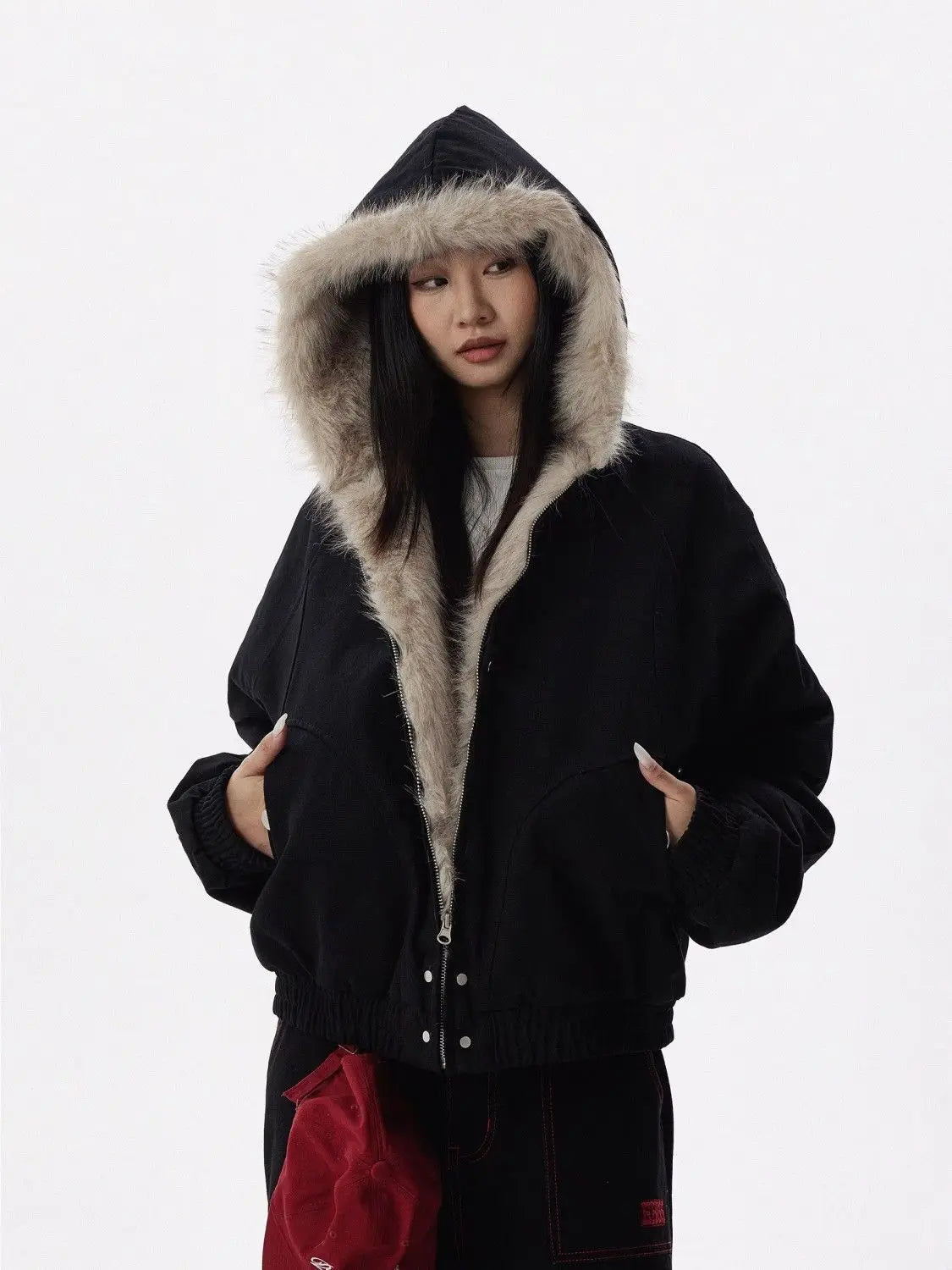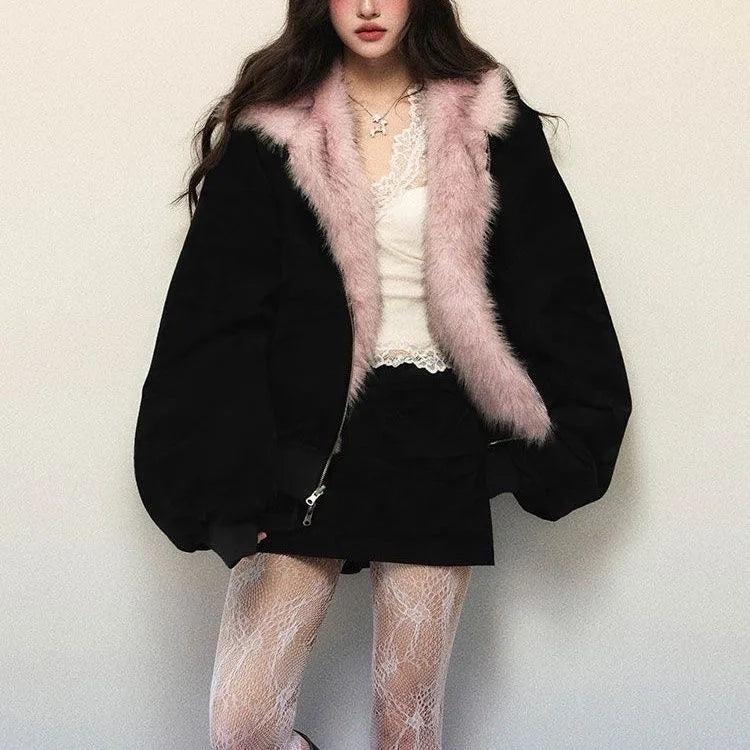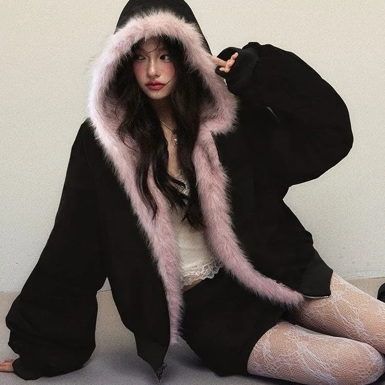 GETADME Y2K Women Clothes Oversize Zip Up Jacket Fox Fur Loose Coats Femme Graphic Jackets Punk Top Vintage Sweatshirts Harajuku Tops