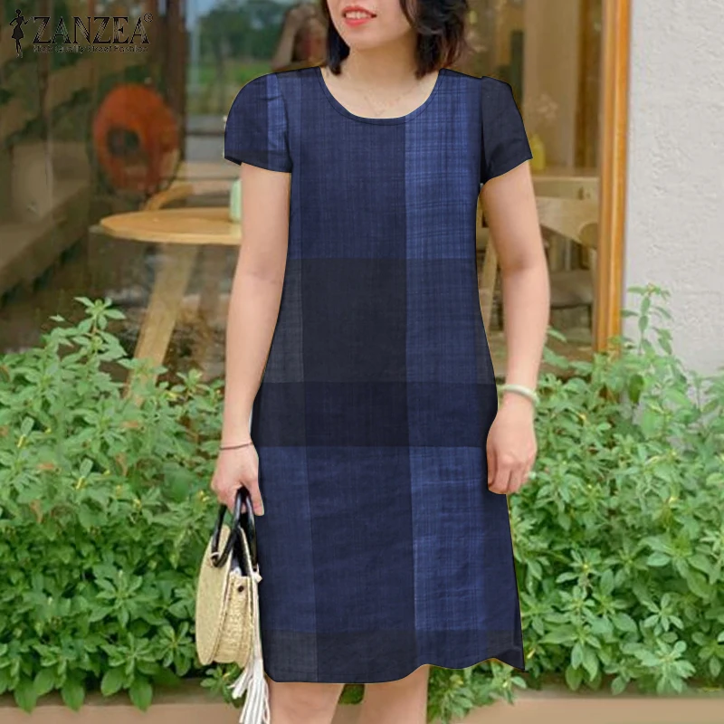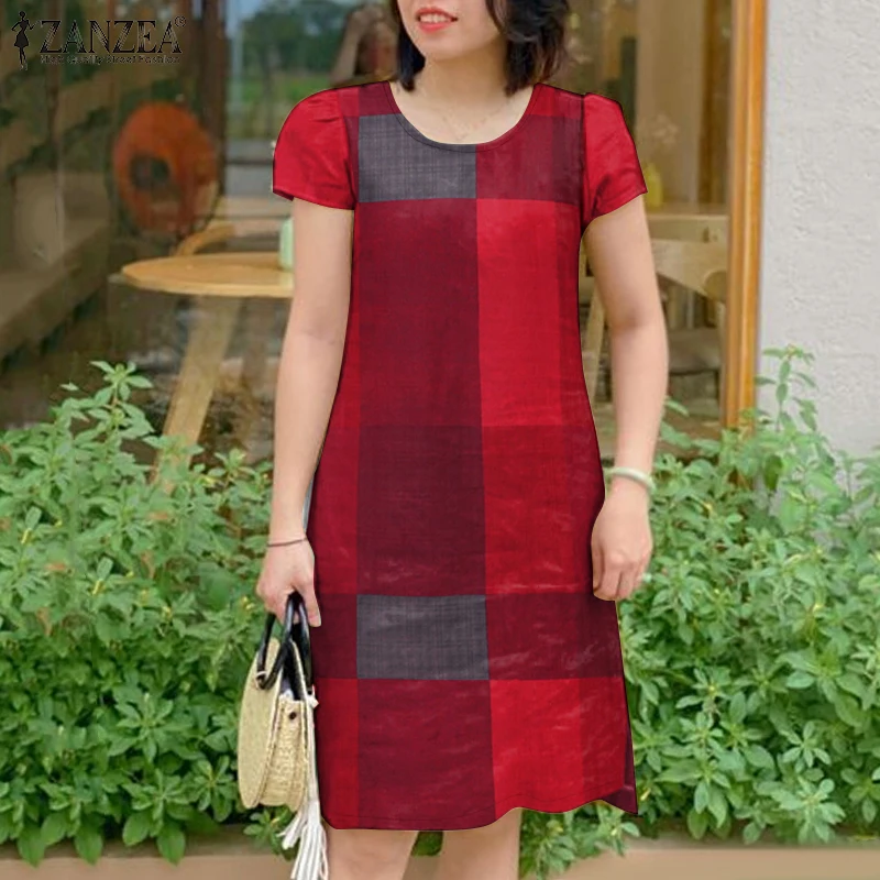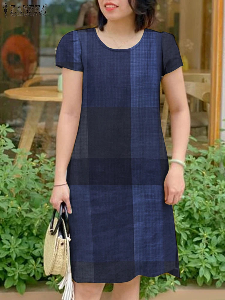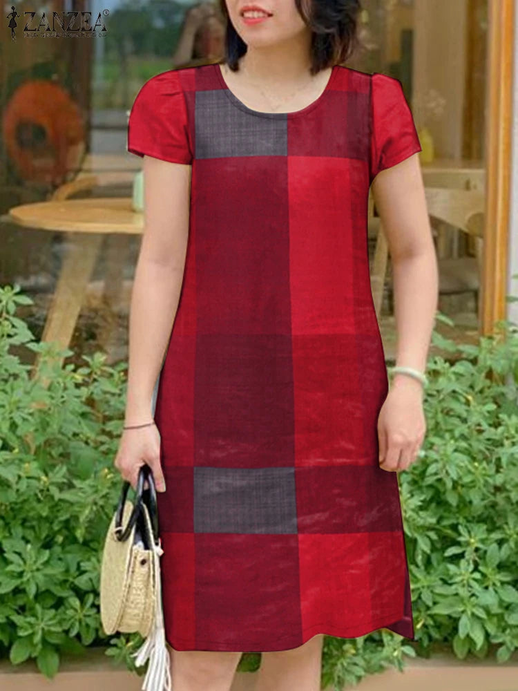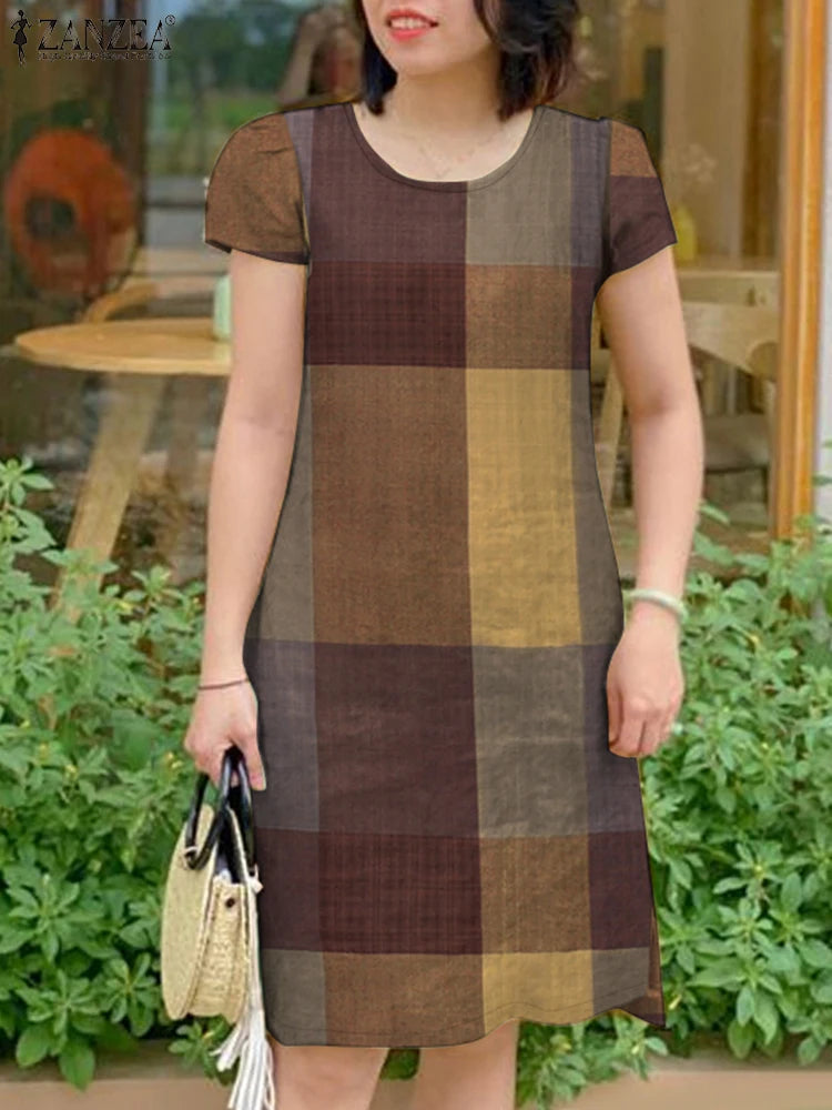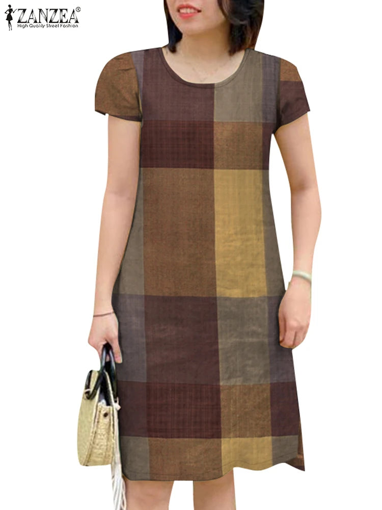 GETADME ZANZEA Women Vintage Short Sleeve Plaid Checked Dress 2025 Summer Sundress Stylish O Neck Knee Length Work Vestidos Robe Femme
