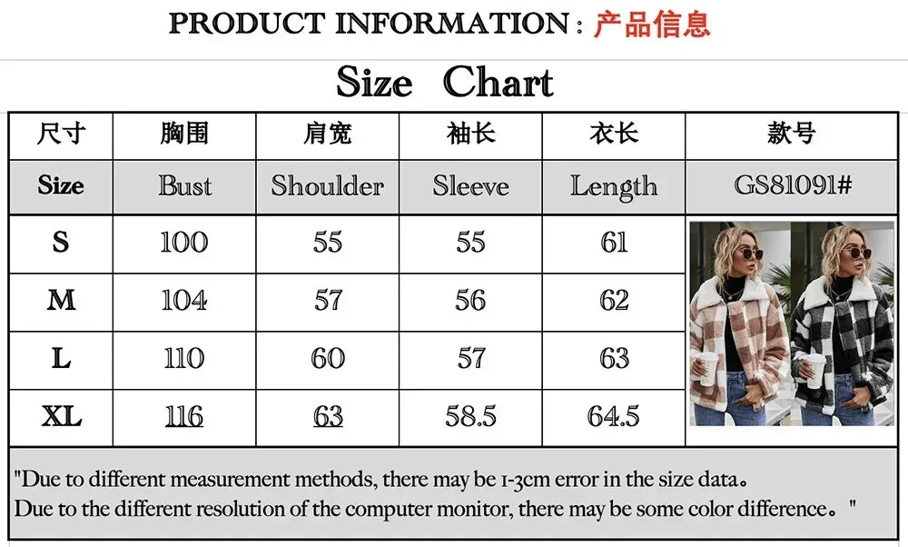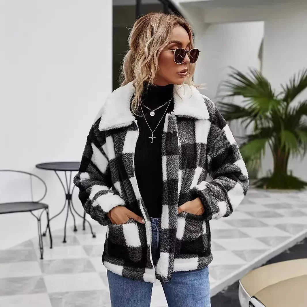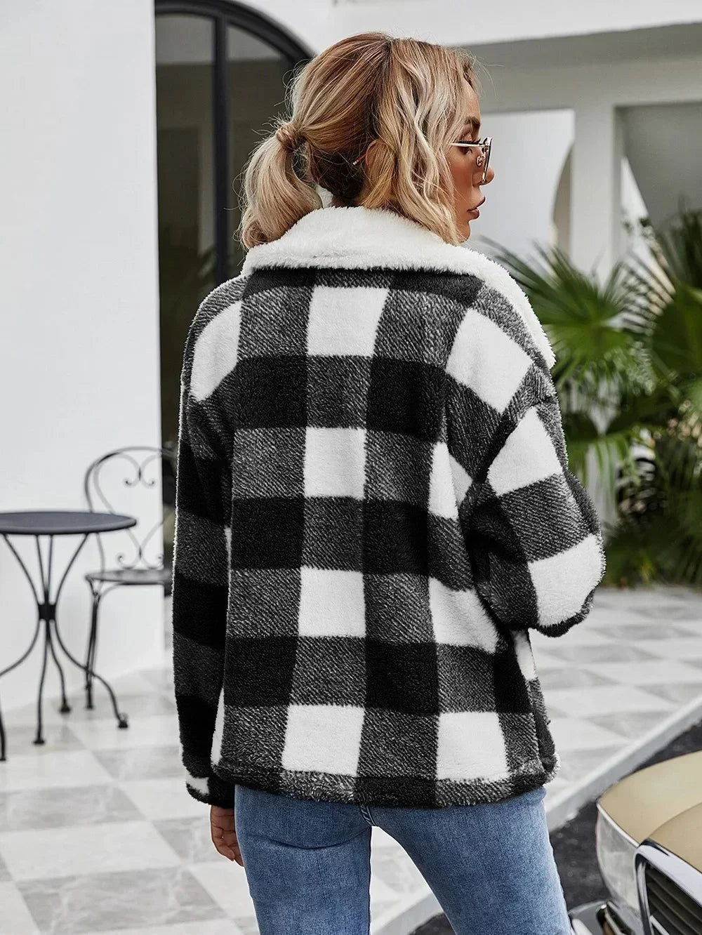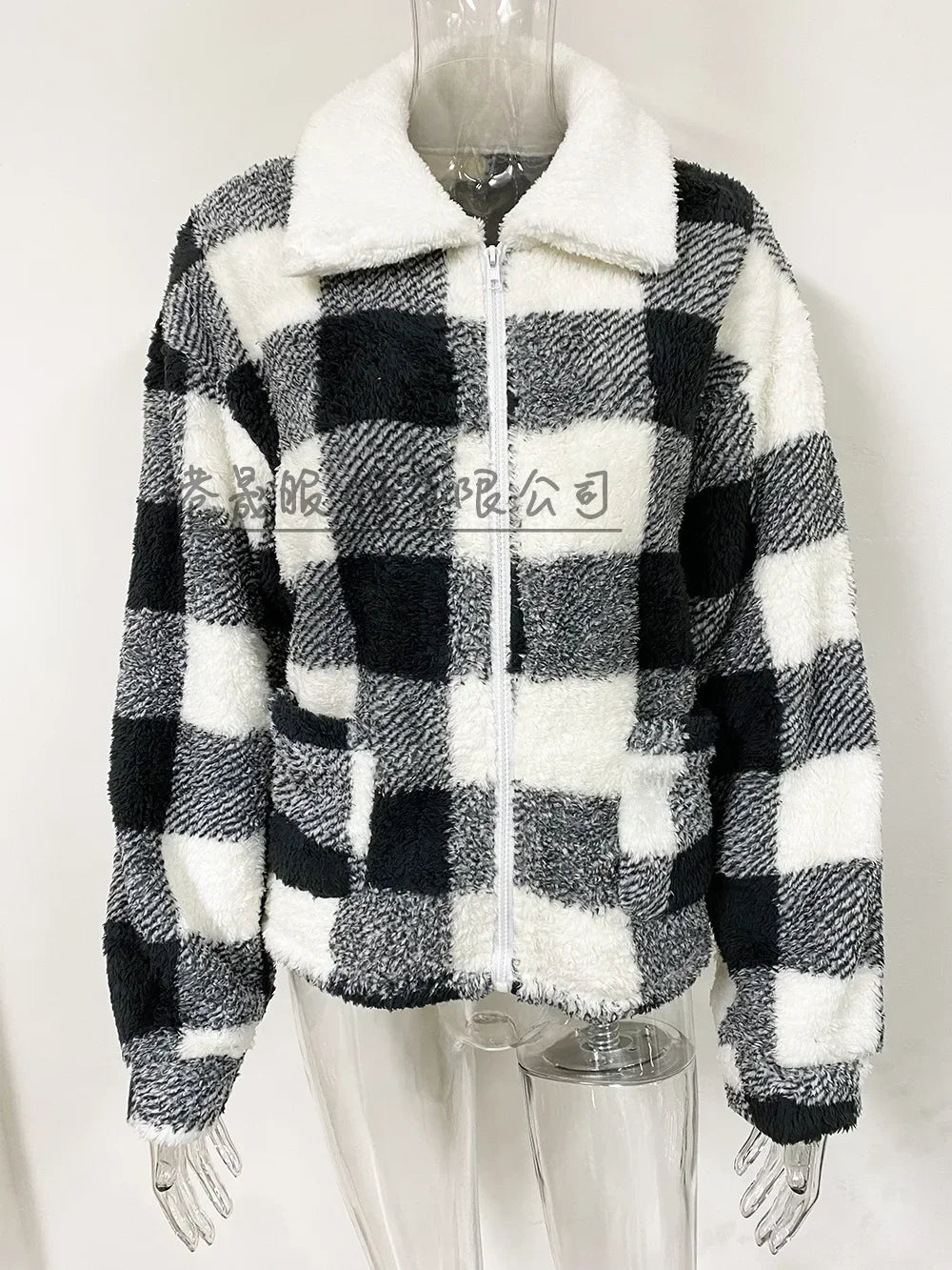 GETADME Zipper Cardigan Coats Outwear Lapel Plush Plaid Casual Fleece Jackets Women Autumn and Winter Jacket Loose Pockets Outwear
