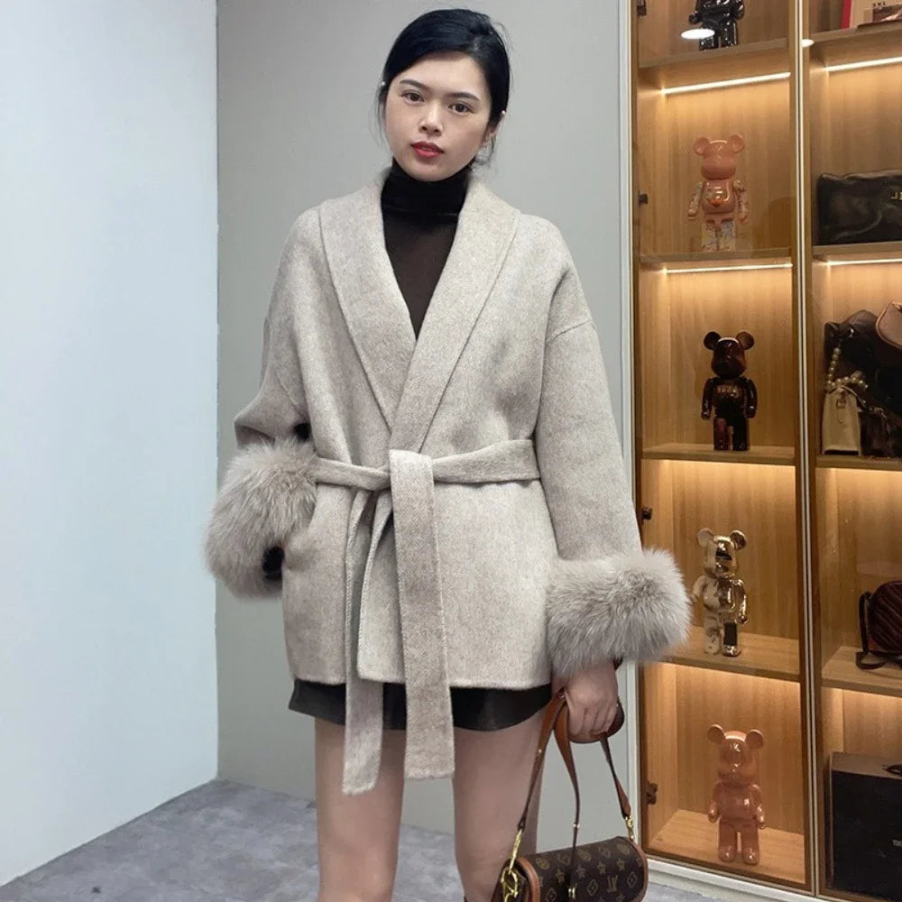 High End Double-sided Wool Strapping Real Wool Fur Coat Women's Removable Cuffs Fox Fur Temperament Cashmere Short Jacket