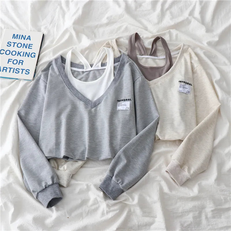 Getadme Korean Fashion Women Fake Two Pieces Strapless Crop Top Preppy Style Harajuku Swearshirt Loose Casual Pullovers Blouses New