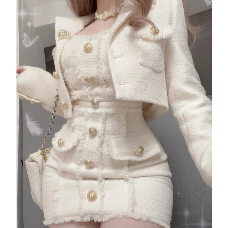 Getadme Korean Style Elegant Vintage Two Piece Set Women Sweet Woolen Short Jackets Tassel Design Mini Dress Suit Female Fashion Outfitn