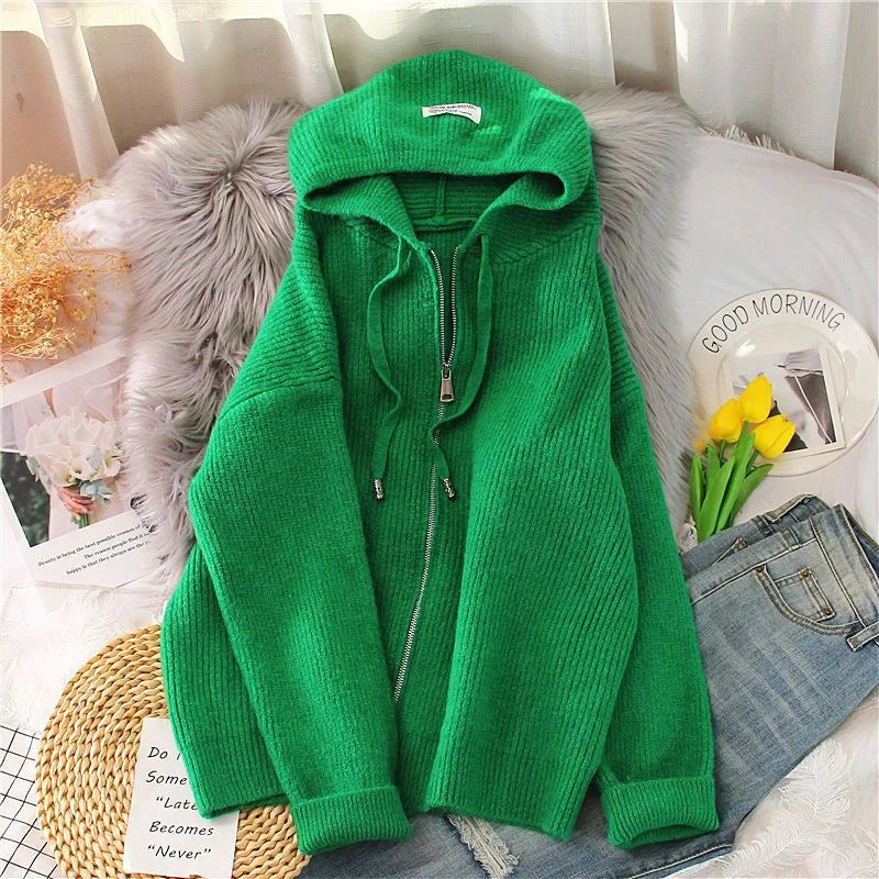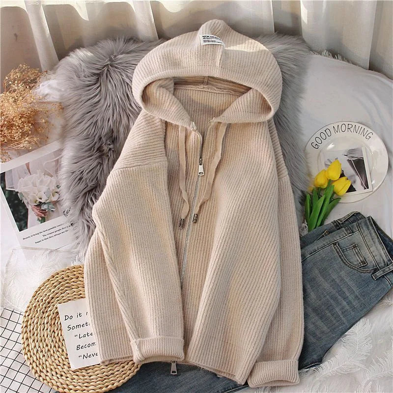 New 2023 Fashion Korean Cardigan Sweater Jacket Women Hooded Solid Color Loose zipper Sweater Female Elegant Knitwear Overcoat