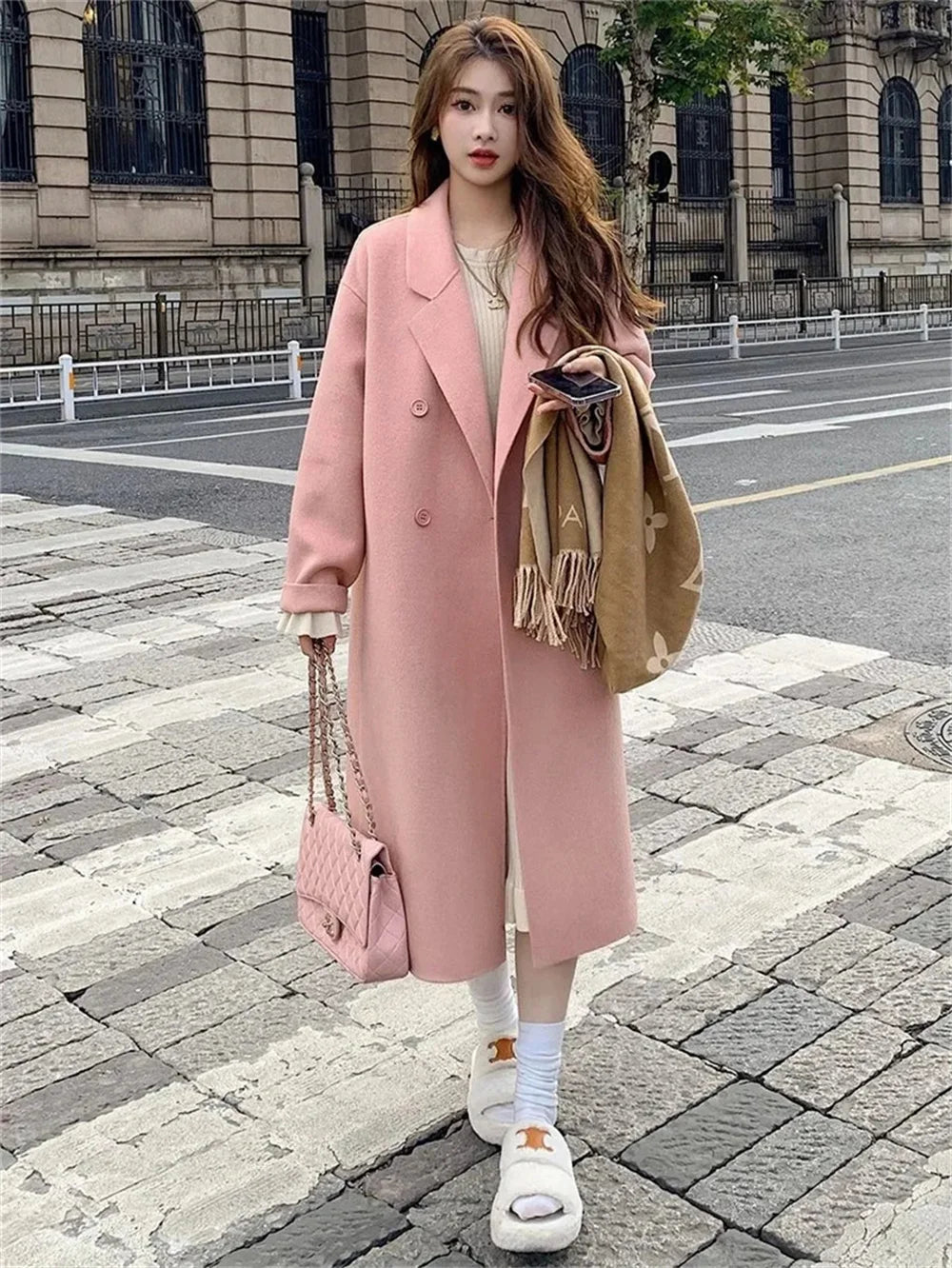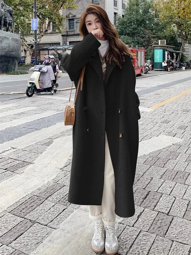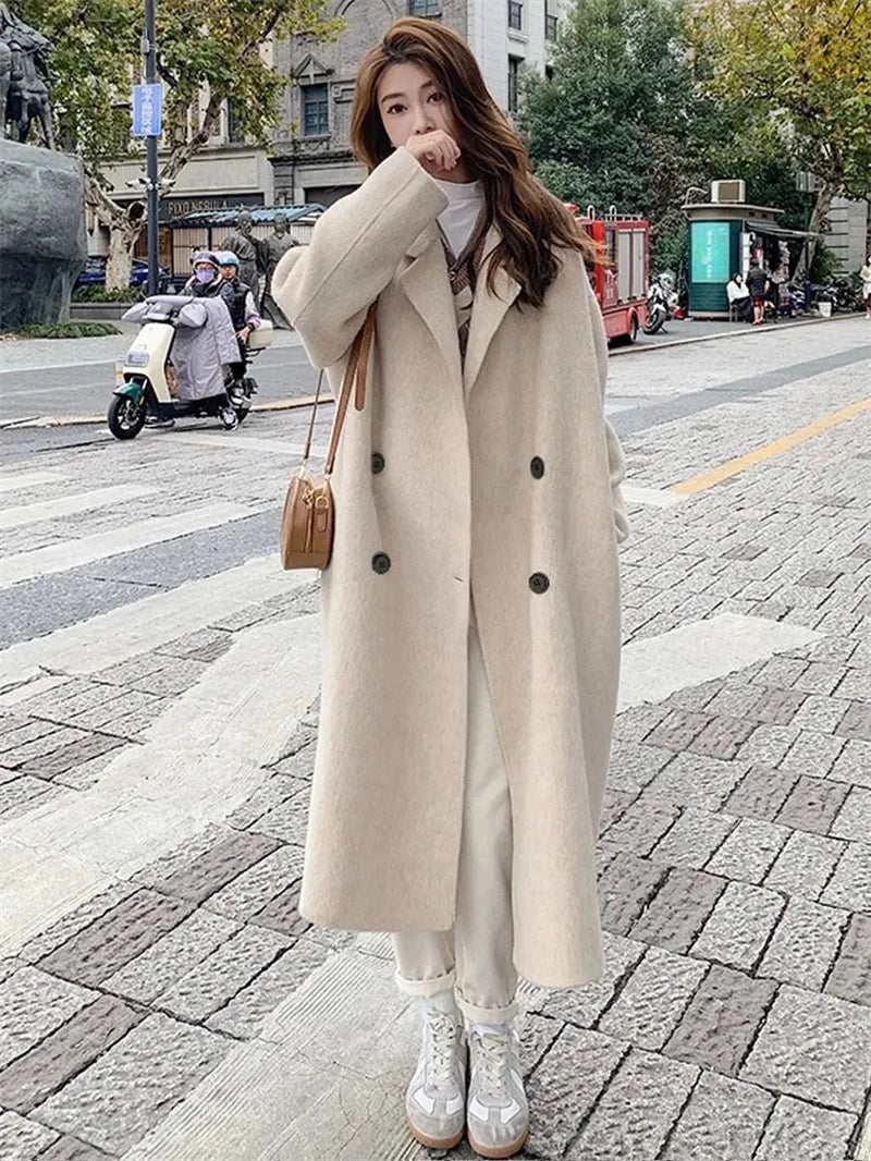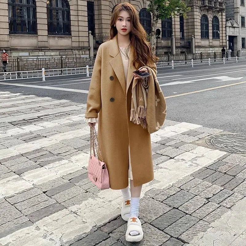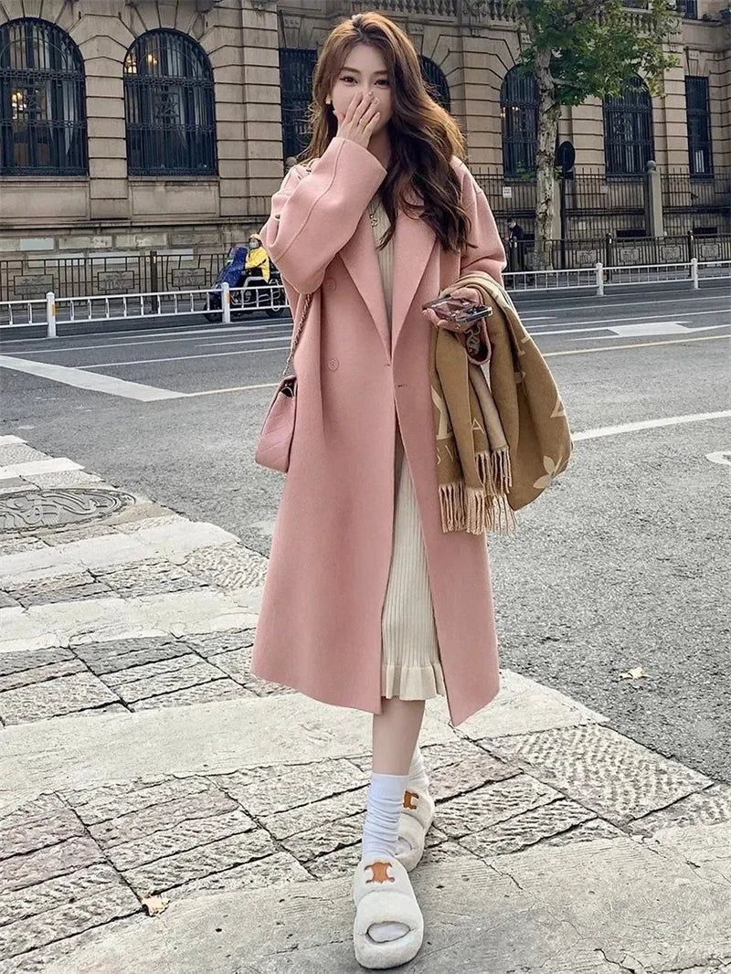 Pink Woolen Coat Women's Mid length 2023 Autumn/Winter New Korean Version Loose and Versatile Hepburn Style Small Woolen Coat