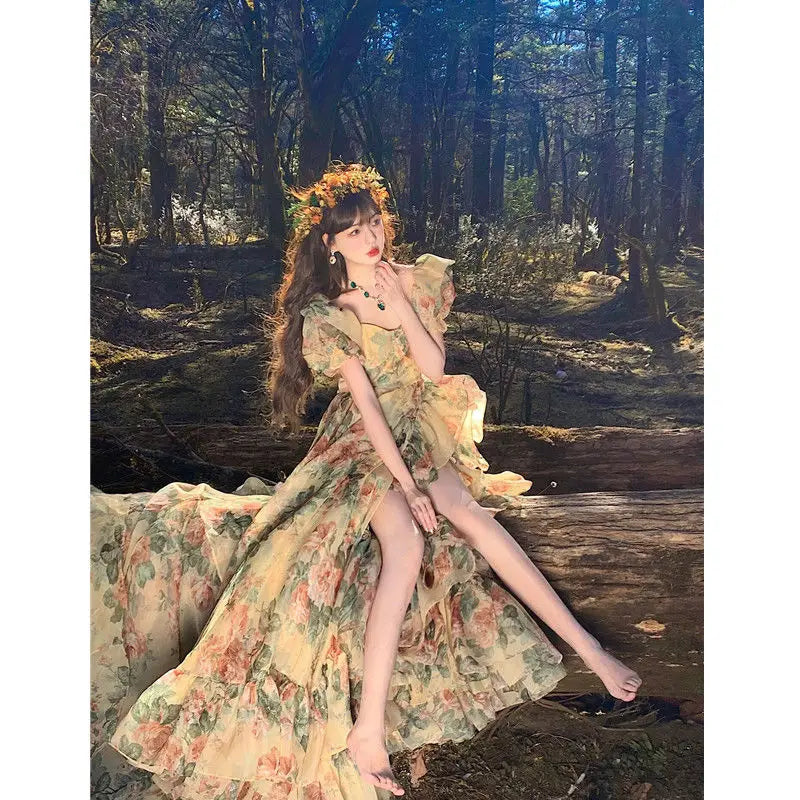 Getadme Ruffleds Floral Long Dresses for Women Summer Casual Short Sleeve Elegant Party Korean Chic Holiday Sweet Female Clothing