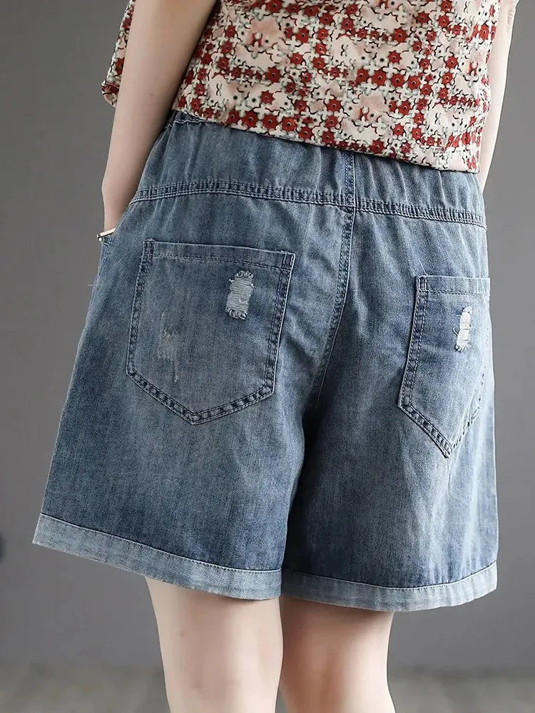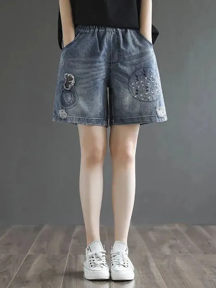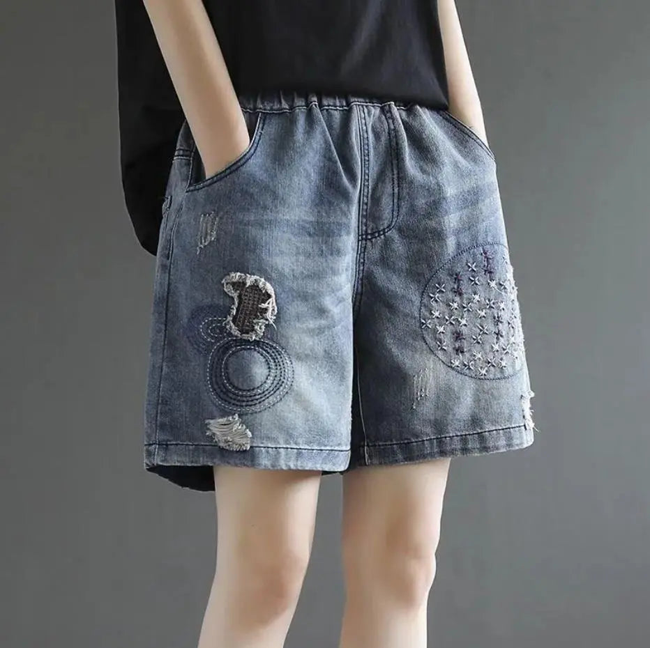 Summer Vintage High Waist Embroidery Denim Shorts S-3xl Hole Loose Women Pants Fashion Elastic Waist Streetwear Wide Leg Pants