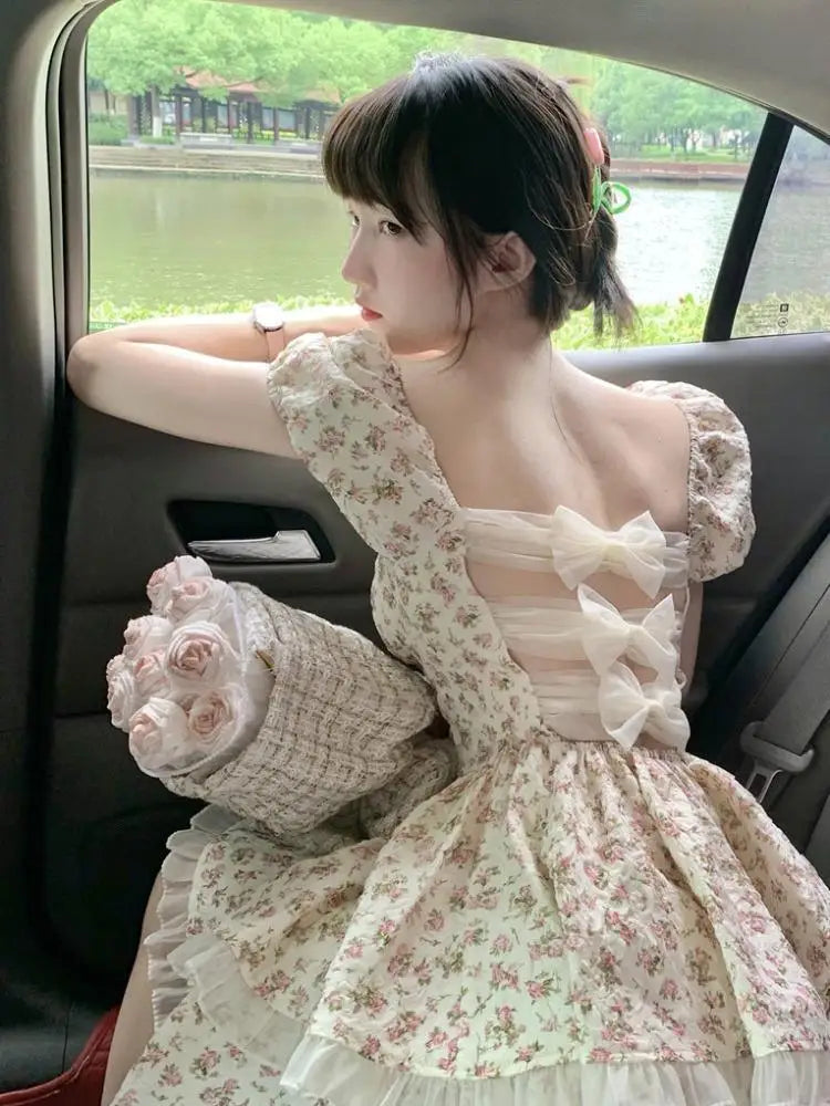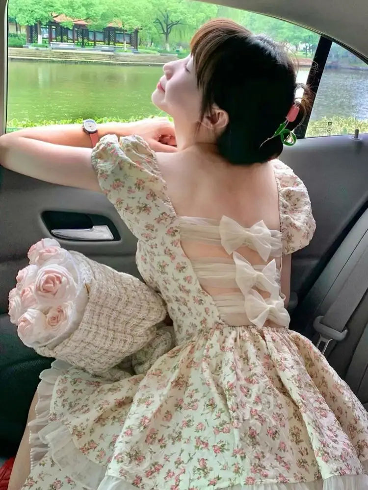 Tea Break French Dresses Floral Bubble Sleeve Dress 2024 Women Summer Waist Backless Bow Princess Poncho Vestido